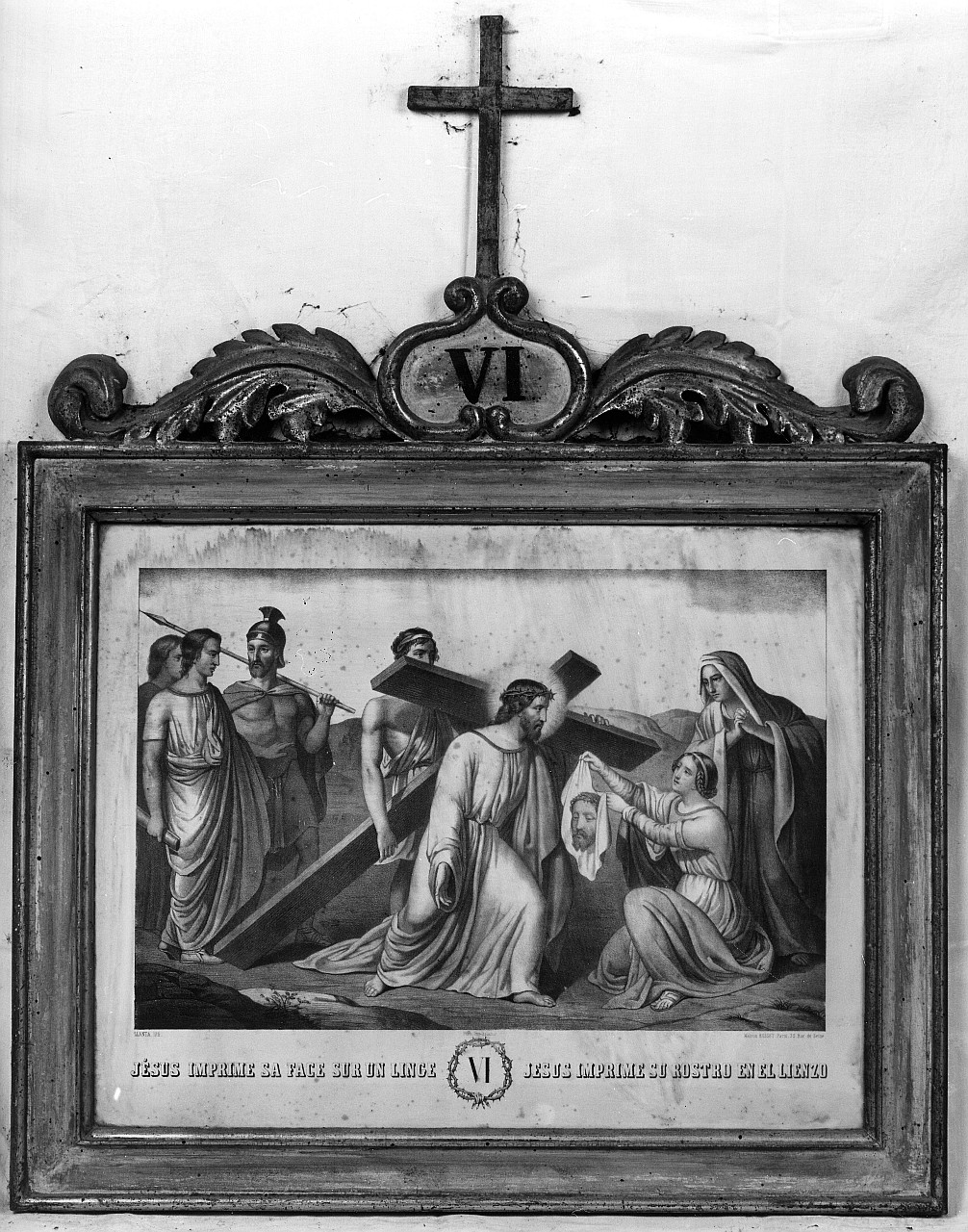 - NOTIZIE STORICO CRITICHE Serie di 13 incisioni su carta raffiguranti la Via Crucis con scritta in caratteri capitali sottostanti l'incisione in lingua francese e spagnola suddivisa al centro dal numero in cifre romane della stazione circondata da una corona di spine. La serie è di buona qualità e di provenienza francese, probabilmente tratta da un analogo ciclo pittorico databile per i suoi caratteri alla prima metà del XIX secolo, come le cornici. Il ciclo è di acquisizione recente, dovuta al vecchio parroco della chiesa