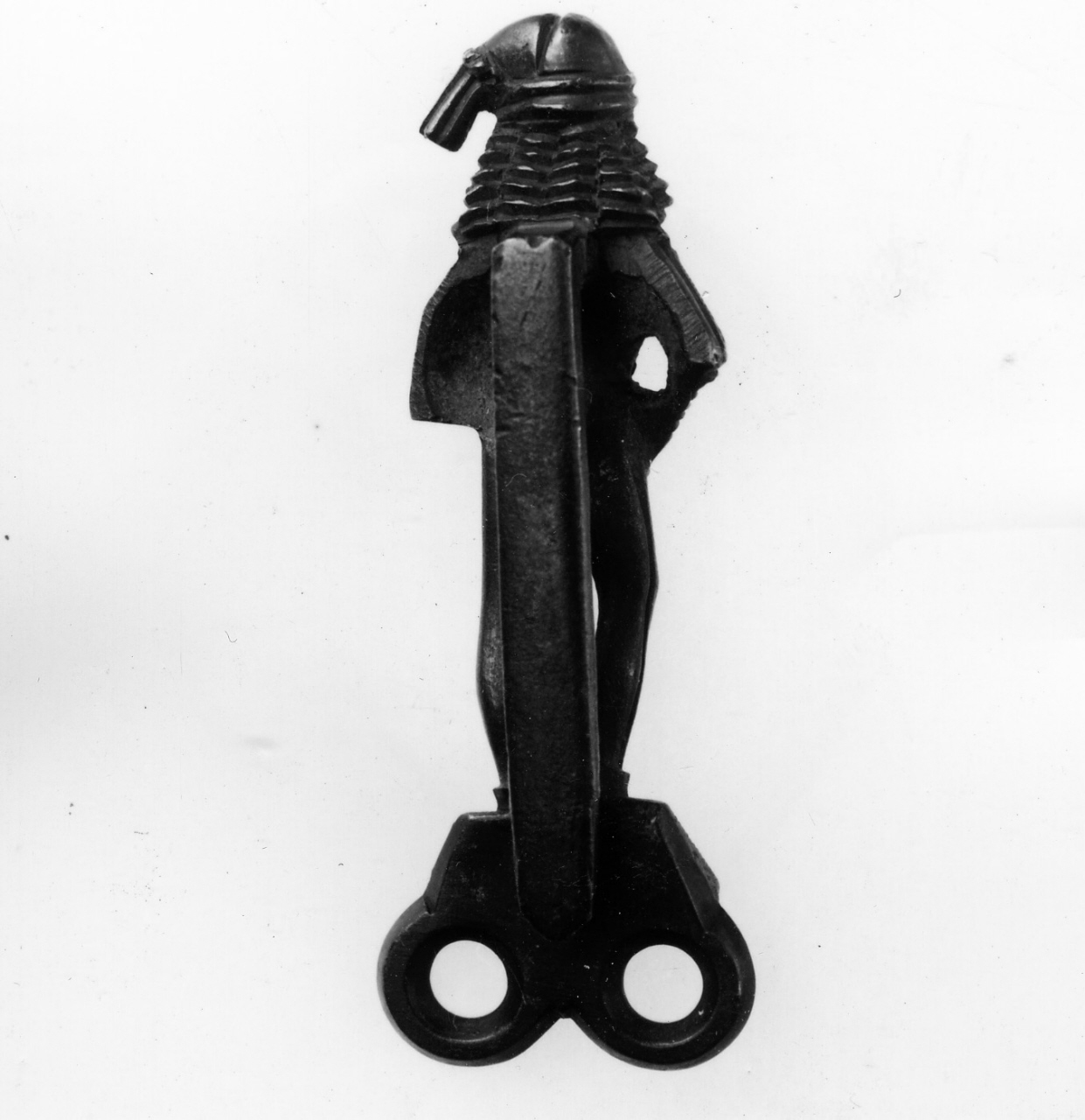 - NOTIZIE STORICO CRITICHE La lavorazione è piuttosto grossolana, il pezzo non è di alta qualità. I particolari, come i dettagli del costume, sono accennati in modo approssimativo. Va anche notato che non esistono molti tipi di uncini formati di figure come questo. L'uomo in piedi, con abito tardo-gotico, con la borsa del denaro e la spada si ritrova ancora in quattro altri esemplari tutti della coll. Figdor che in parte furono acquistati dal Schlossmuseum di Berlino. Un altro tipo mostra la figura di un uomo, con tutte e due le mani appoggiate ai fianchi, gonnellino corto e copri capo a cappuccio. Conosciamo sei esemplari di questo tipo nei Musei di Bruxelles, Augusta, Spira, Amburgo e Parigi. E' possibile che lavori in metallo, che presentano varianti così piccole, siano stati prodotti in una zona abbastanza ristretta; si potrebbe pensare alla fonderia di Liegi. In base all'abito, questi oggetti si possono datare, con sufficiente sicurezza, verso la fine del XV secolo. IN quel periodo le cinture con ricche guarnizioni erano ormai solo per le donne. Sembra addirittura che soltanto in quell'epoca fosse di moda portare appesi alla cintura ogni genere di utensile, come portaaghi, calendarietti, posate (coltello e forbici), chiave e borse. Per lo meno i pittori dell'epoca rappresentarono questi oggetti ben in vista nei loro quadri. Per attaccare tutti questi oggettini occorrevano soprattutto dei ganci che non erano applicati fissi alla cintura, ma poteano essere staccati a volontà e senza problemi come quello della coll. Carrand