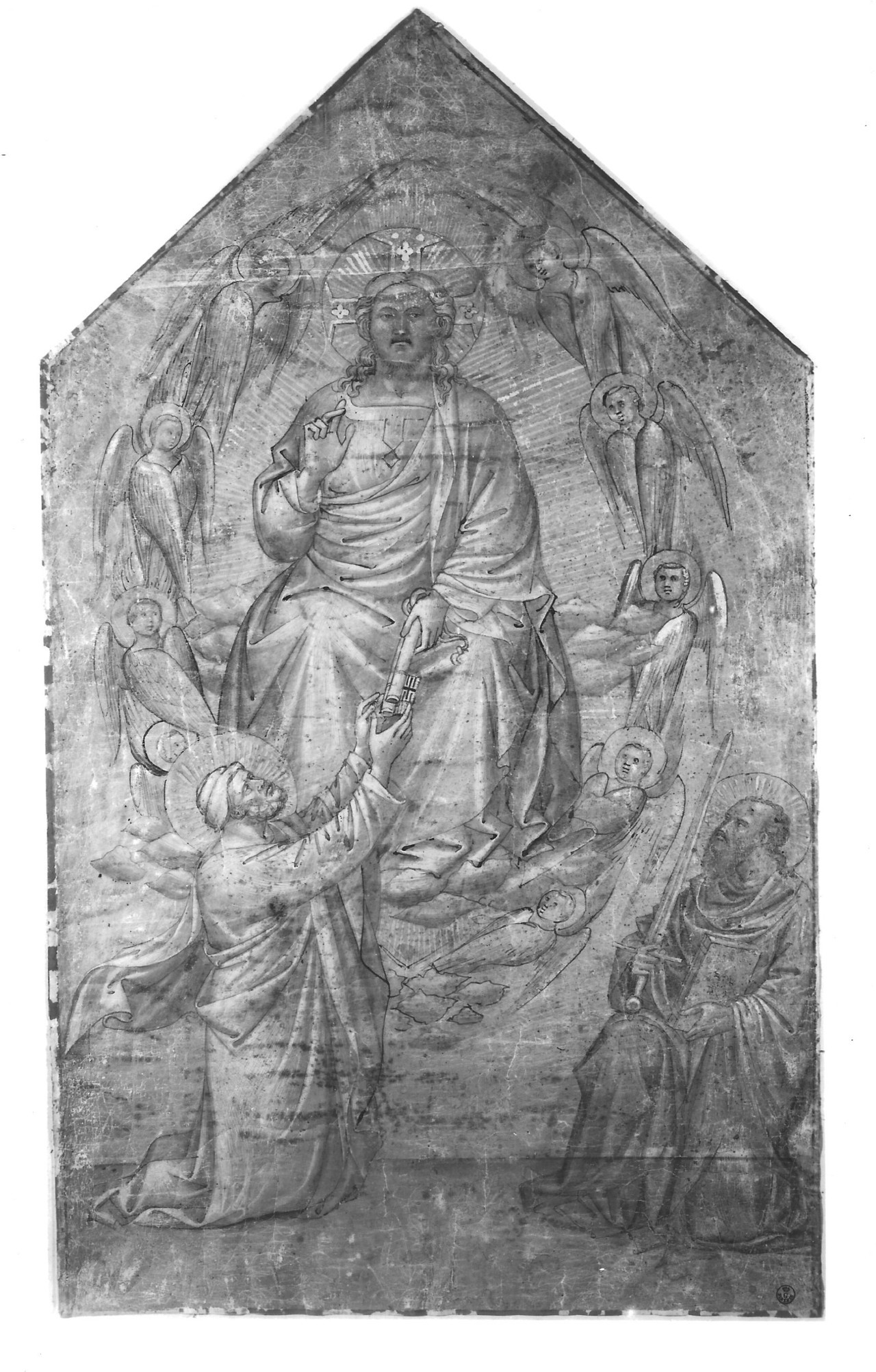 La grande pergamena a forma cuspidata raffigura Cristo seduto sulle nubi entro una mandorla di cherubini: con la mano destra benedice mentre con la sinistra consegna a Pietro, inginocchiato in primo piano a sinistra, le chiavi. Assiste alla scena San Paolo, a destra con la spada e un libro in mano