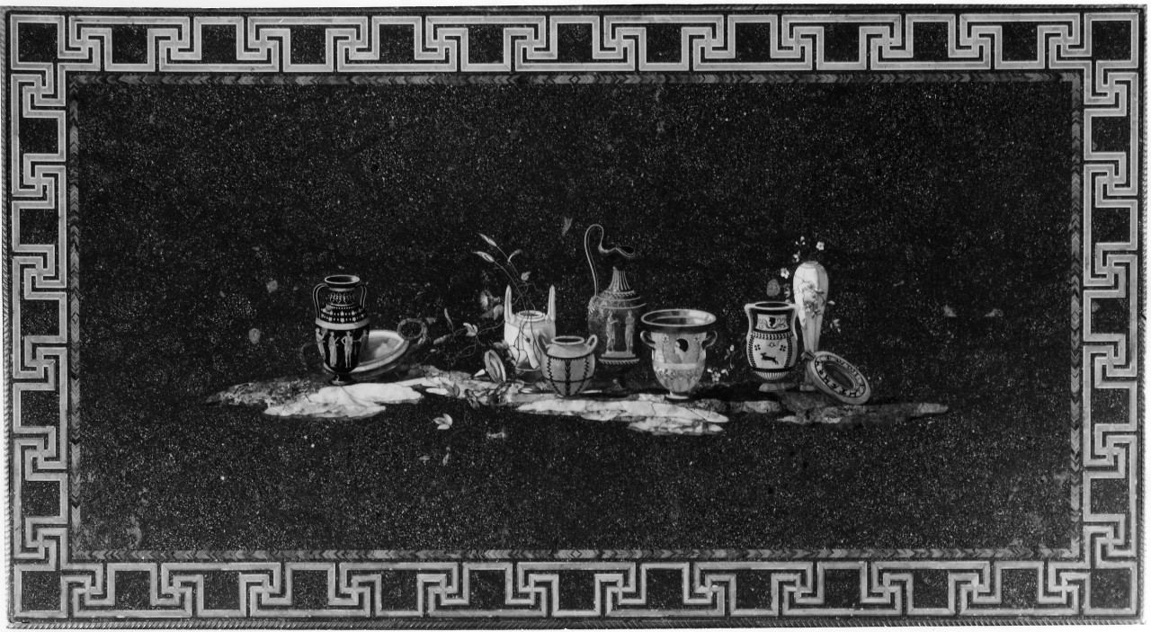 Piani di porfido con vasi di forma diversa e fiori lavorati a commesso di pietre dure. Bordo del piano formato da un ornato a greca di marmo giallo di Sicilia con un listello di diaspro di Sicilia racchiuso entro una cornice di bronzo dorato