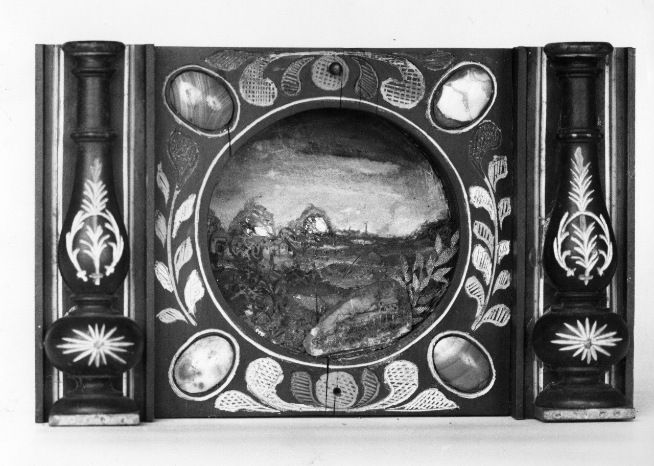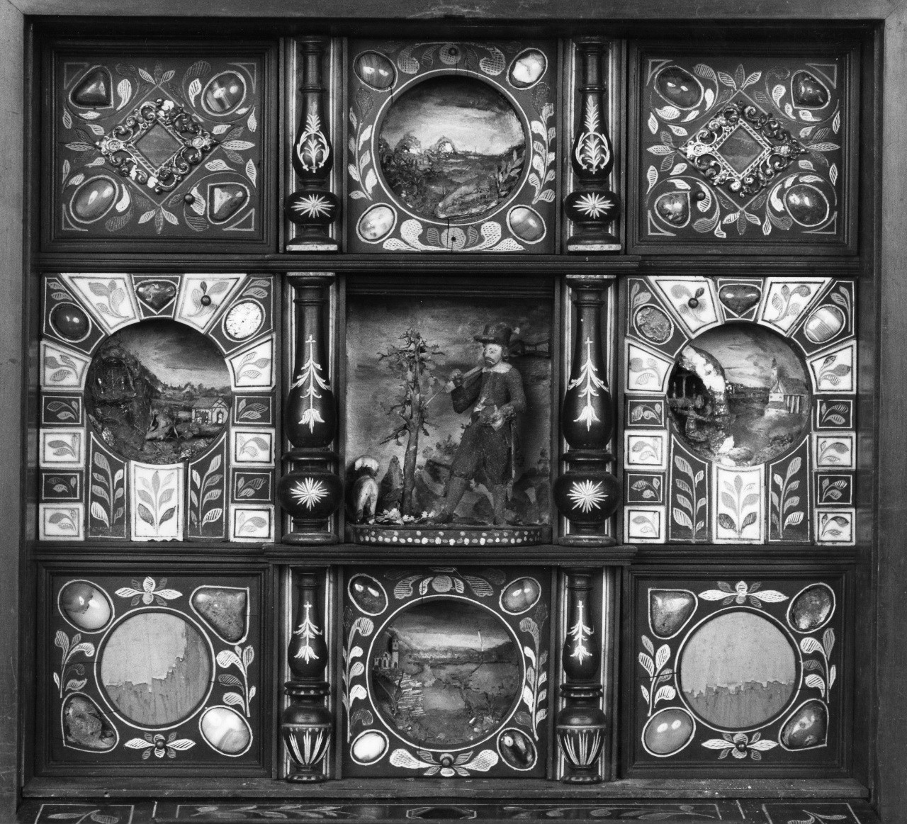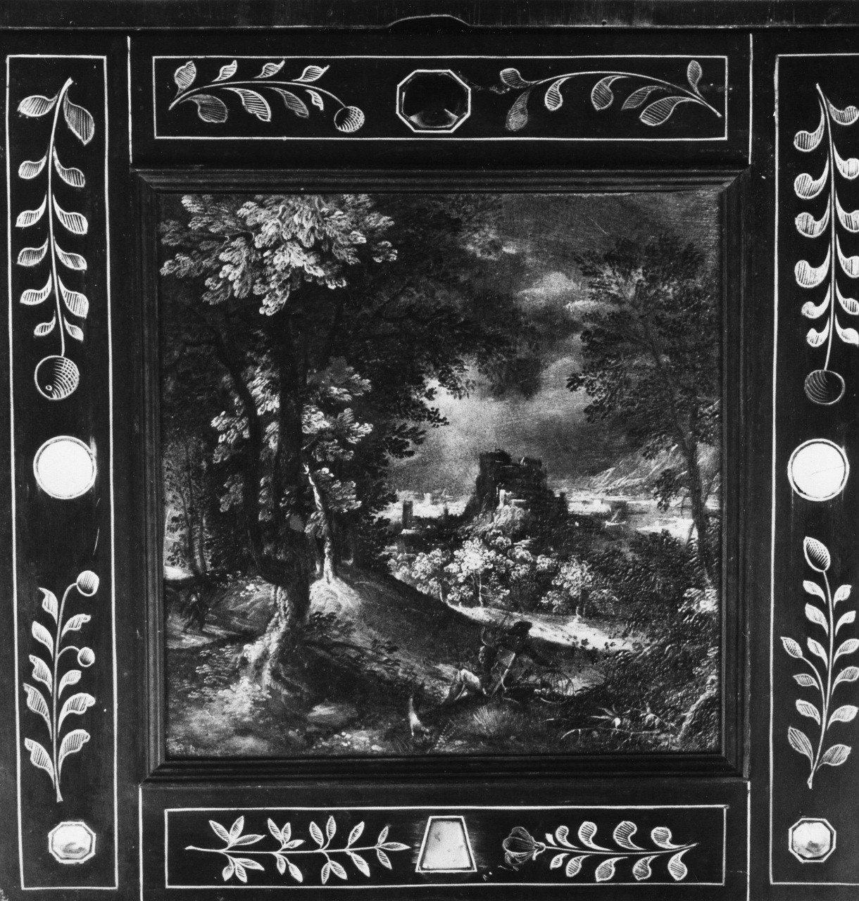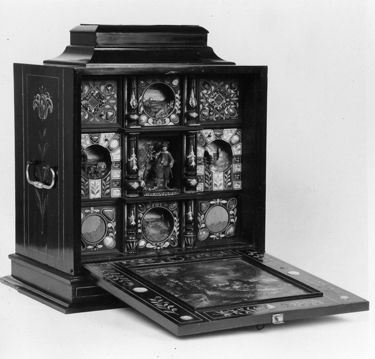 - NOTIZIE STORICO CRITICHE Piccolo stipo del sec. XIX pervenuto da Parma il 15.1.1869. La bassa qualità d'esecuzione e il disegno inciso e colorato nel legno significano con ogni probabilità trattarsi di un'imitazione. Solo il quadro con il paesaggio è opera del XVII sec