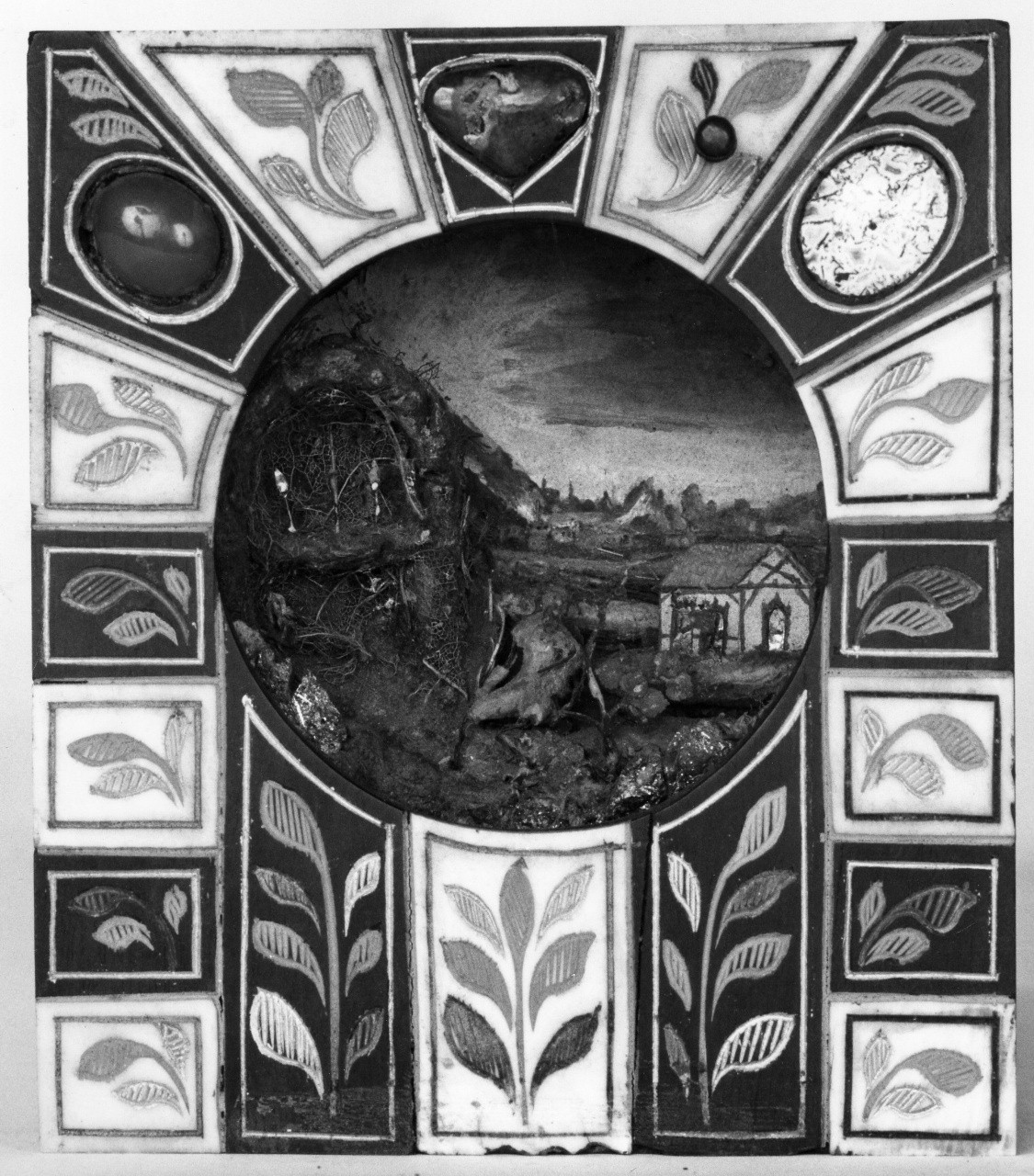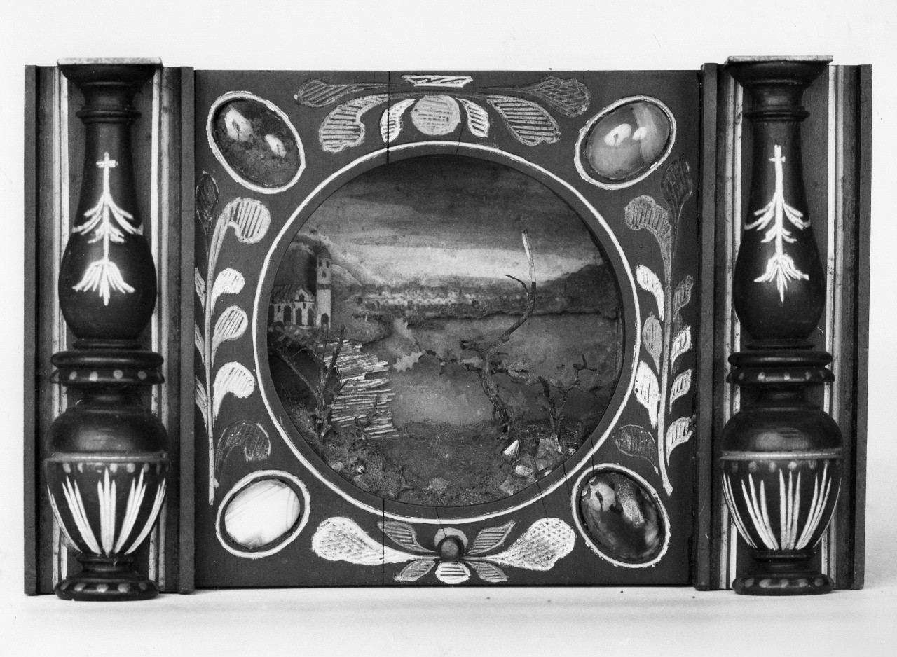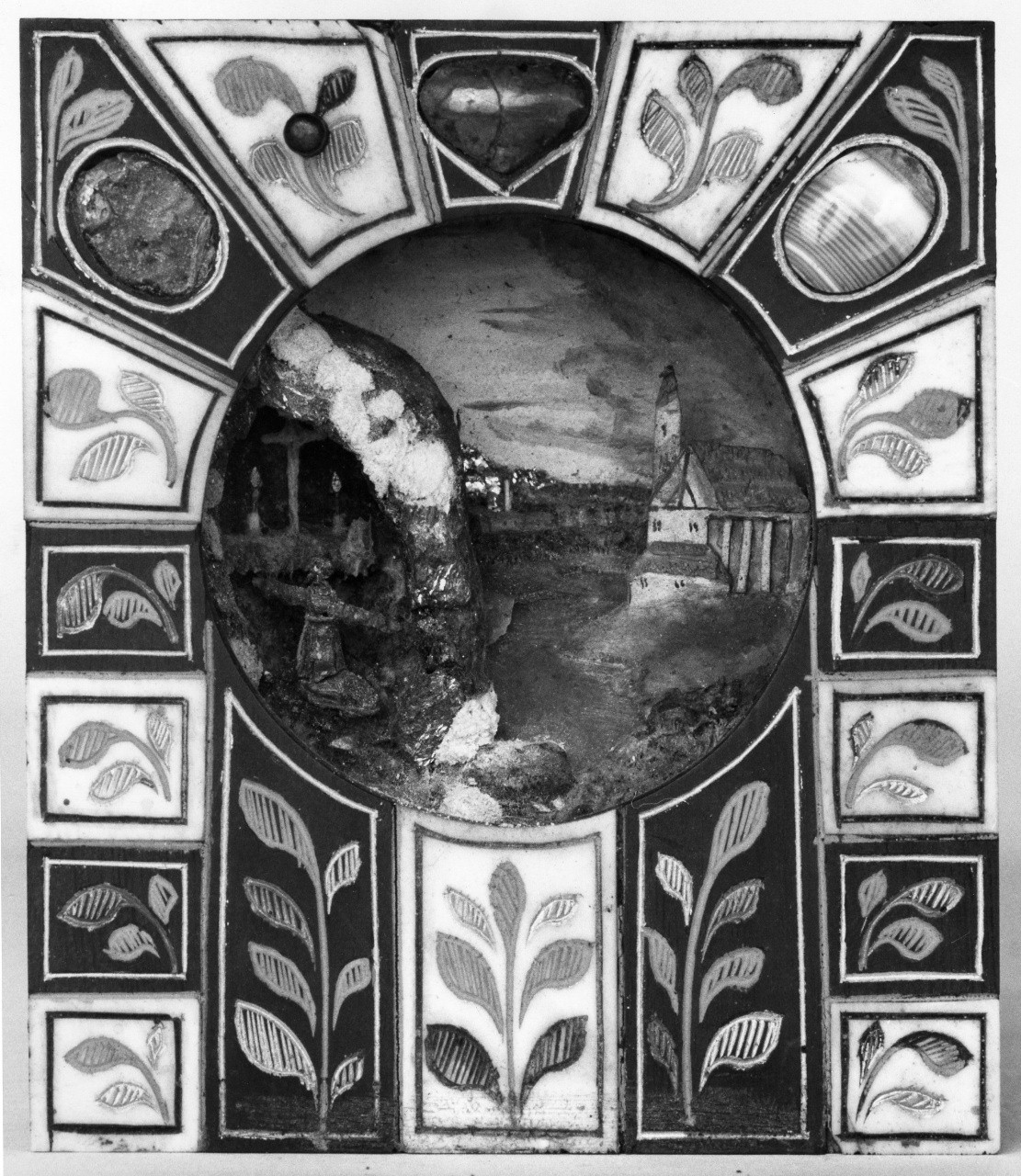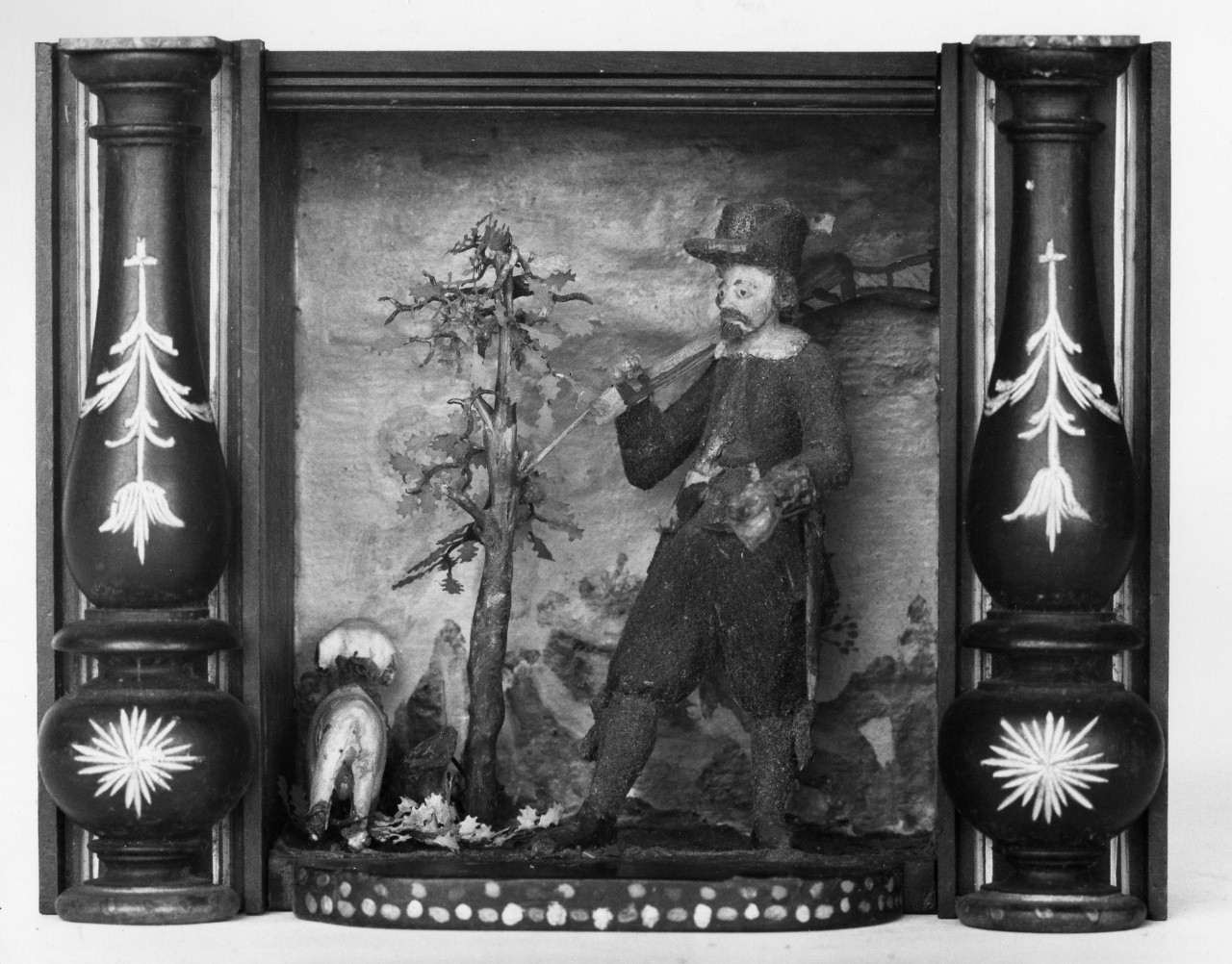 - NOTIZIE STORICO CRITICHE Piccolo stipo del sec. XIX pervenuto da Parma il 15.1.1869. La bassa qualità d'esecuzione e il disegno inciso e colorato nel legno significano con ogni probabilità trattarsi di un'imitazione. Solo il quadro con il paesaggio è opera del XVII sec