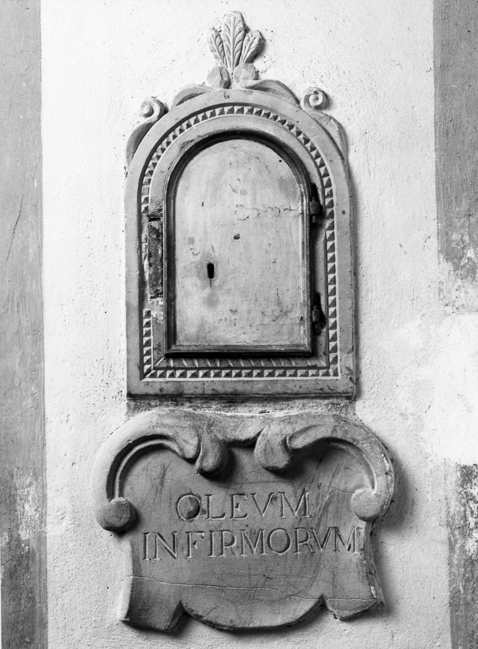 Mostra di tabernacolo in pietra serena per gli olii santi; lo sportellino è in legno verniciato di bianco e profilato d'oro; mentre la mostra ha una cornice decorata da un motivo a bugnato tagliato a diamante, coronata da riccioli affrontati ai lati di un gruppo di foglie. Nella parte inferiore un cartiglio con cornice a riccioli