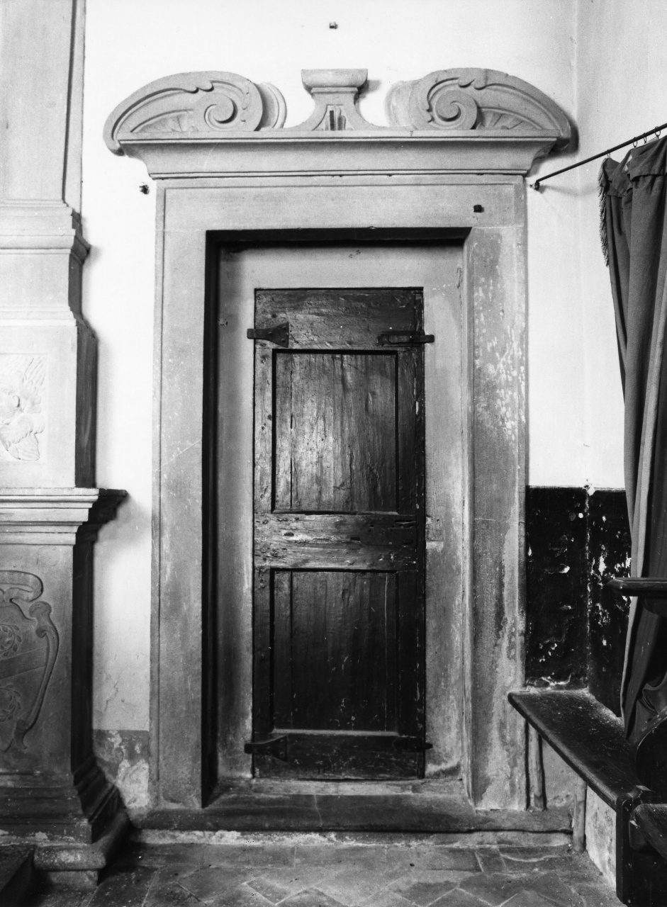 Mostra di porta in pietra serena con cornice liscia e decorata solo nella parte superiore da una cimasa modanata e coronata da un frontone spezzato con due riccioli laterali mossi da foglie di acanto affrontati ai lati di un piedistallo centrale