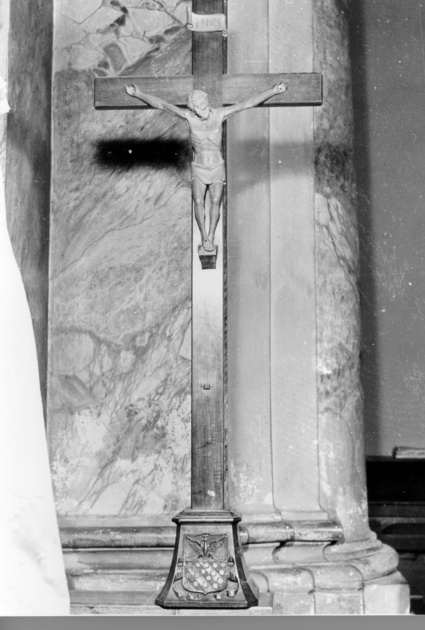 Sulla base a forma di tronco di piramide è scolpito uno scudo con stemma