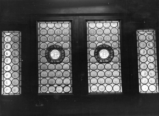 Vetrata costituita da dischi di cristallo leggermente colorati, blu e rosa, legati a piombo. Al centro corona di alloro con iscrizione