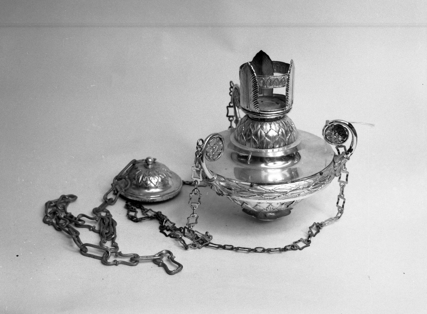 Il bordo della lampada è decorato con festone; motivo a foglie nella sotto coppa, nella parte terminale e nella campanella