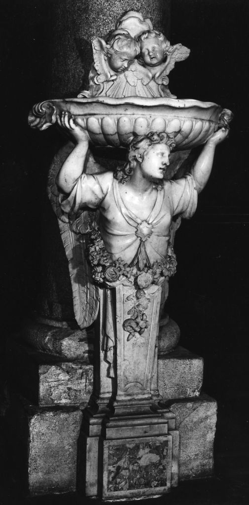 Acquasantiera.Coppia di acquasantiere in marmo bianco scolpito. Gli oggetti, addossati allecolonne del coretto, sono costituiti da semipilastri dai quali sorgono angeli-telamone,cinti in vita da un serto di fiori, che sorreggono con le mani levate le vasche.Queste sono a forma di conchiglia, inferiormente baccellata, e sormontate danuvolette e teste di cherubino