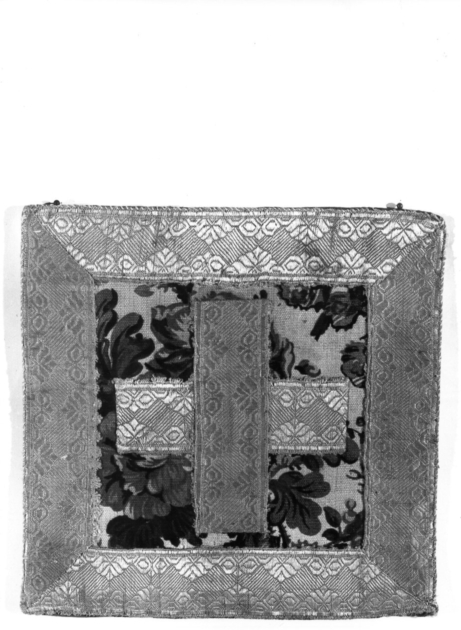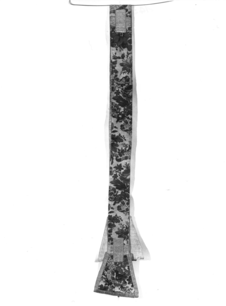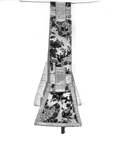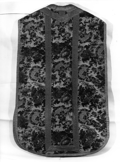Pianeta bianca con disegno policromo, completa di stola, manipolo e borsa di corporale. Nastri con andamento ondulante verticale, che si aprono a formare motivi a ventaglio, si susseguono paralleli, intrecciati a mazzi di fiori. Galloni in seta gialla a nastro ondulante