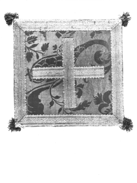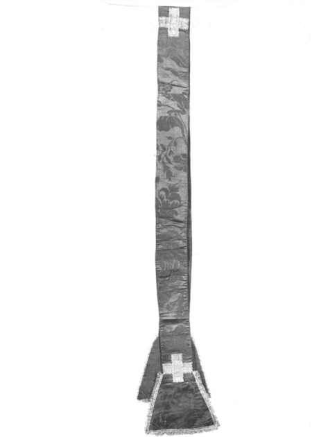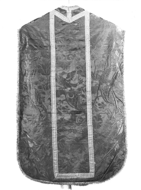 Pianeta rossa completa di stola e borsa per il corporale. Teorie di composizioni di fiori grandi e fantasiosi si alternano in verticale a teorie di foglie a ricciolo campite a motivi geometrici, sormontate da aquilotti ad ali aperte e rampanti. Galloni in seta e oro filato a losanghe. La borsa ha quattro nappe in seta, agli angoli