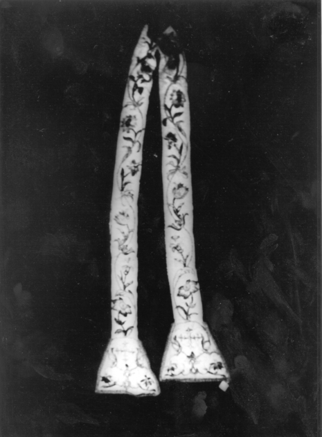 Pianeta bianca corredata di stola, manipolo, velo da calice e borsa di corporale, con disegno in seta policroma e oro filato. Nella pianeta, tralci di fiori e foglie si snodano con andamento ondulante partendo da due cornucopie poste alla base e da una cesta centrale colma di frutti. Negli altri oggetti, tralci di fiori e foglie