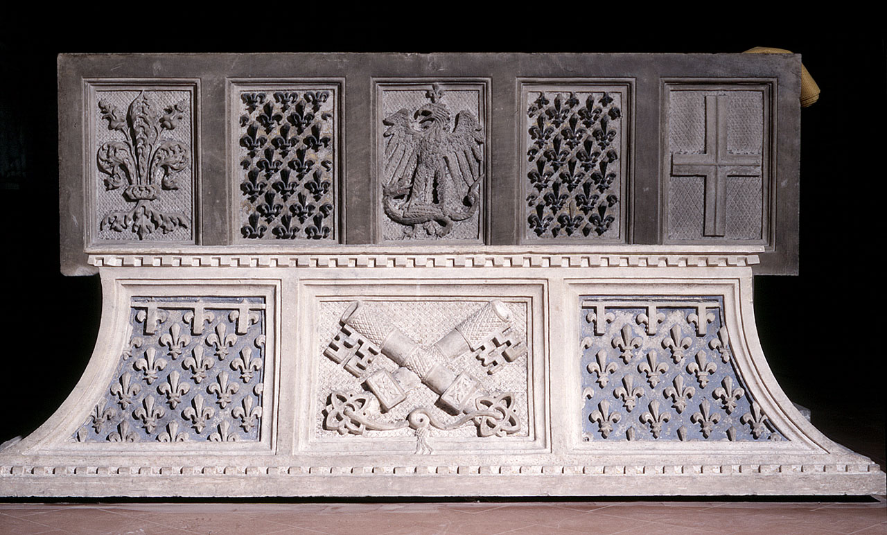 - NOTIZIE STORICO CRITICHE Il sarcofago reca scolpita sulla faccia anteriore una scena raffigurante i l mito di Fetonte. L'opera, appartenente al periodo romano, fu riutilizzat a nel XIV secolo come sepolcro del Farnese. A tale epoca risalgono i rilie vi sugli altri tre lati del sarcofago con le armi dei Franese e della citt a' di Firenze. L'Ammirato (1600-1641) ricorda il sepolcro di Piero da Farn ese comandante fiorentino "sopra la porta a lato del campanile" nella chie sa di S. Maria del Fiore. Dai documenti pubblicati dal Guasti (1887) sempr a probabile che l'opera fosse già realizzata nel 1367. Il sarcofago era so rmontato da una statua equestre realizzata in legno e cartapesta (cfr. Fol lini) raffigurante il Farnese a cavallo. Nel 1395 in occasione di una prim a progettazione del monumento a Giovanni Acuto si incaricarono i pittori A gnolo Gaddi e il Pesello di disegnare una nuova sepoltura per Piero del Fa rnese. Fu forse in quella occasione che fu aggiunta la statua equestre in questione, poi asportata intorno alla metà dell'Ottocento e andata perduta . L'Ammirato attribuiva il monumento ad Andrea Orcagna mentre il Vasari lo riferiva al fratello di questi, Jacopo di Cione. Questa attribuzione è ri petuta dalla storiografia del passato. Recentemente dal Parronchi è stato assegnato alla bottega orcagnesca. La tomba e' variamente datata. Alcuni s tudiosi la mettono in relazione con un documento del 1367, altri con un al tro del 1395. Appare però più ragionevole accettare la prima data per lo s tile dei rilievi caratterizzati da una certa secchezza di trattamento che si ritrova anche negli stipiti della porta dei canonici databile appunto i n quegli anni (cfr. Brunetti). Altri frammenti (una grande base su cui pog giavano i leoni, varie membrature di raccordo tra le parti) si conservano nei depositi del museo