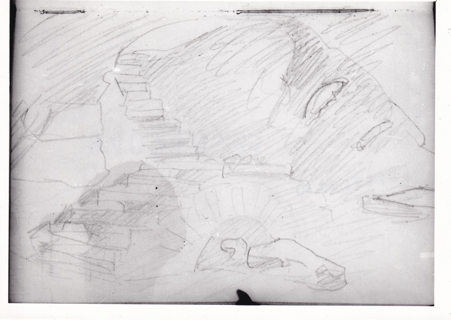 Schizzo sommario di un ambiente sotterraneo con un ponticello in pietra in primo piano e, poco oltre, alcuni gradini, sempre in pietra
