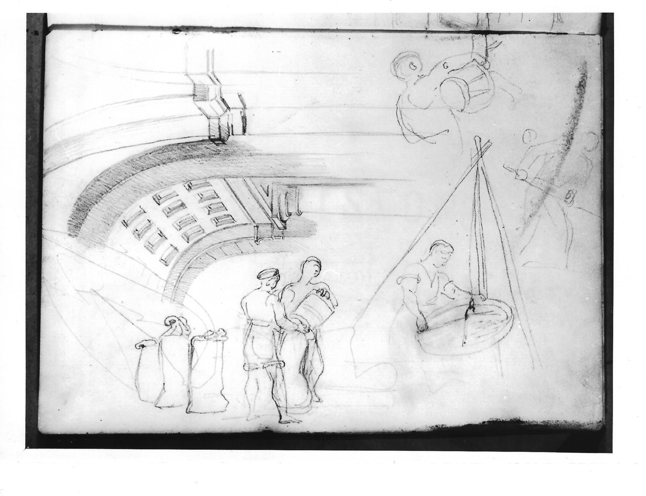 - NOTIZIE STORICO CRITICHE Recto: Le due figure sono tratte da gli affreschi del Ghirlandaio nell'abside di S. Maria Novella, e precisamente da due personaggi in primo piano sulla sinistra dell'affresco raffigurante la Cacciata di Giovacchino dal Tempio. Verso: Il foglio contiene uno scorcio della volta del loggiato degli Uffizi, e alcuni schizzi raffiguranti persone al lavoro che testimoniano l'interesse dell'artista per le scene della vita quotidiana