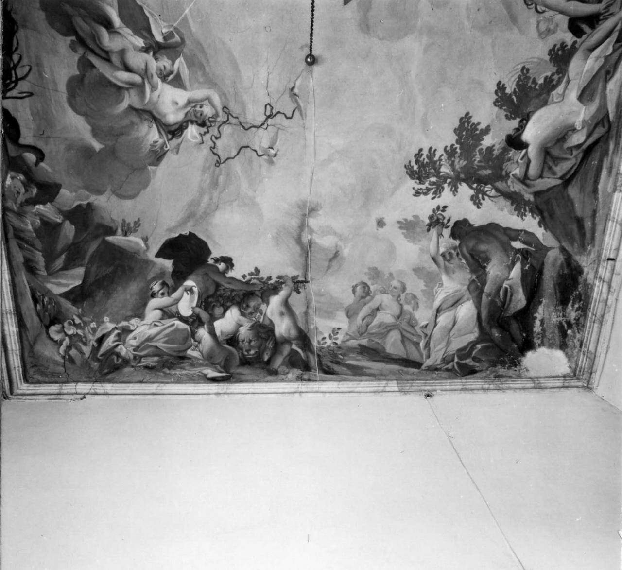 - NOTIZIE STORICO CRITICHE L'età dell'oro, il mitico momento felice vissuto dall'uomo prima del suo ingresso nella storia, viene riproposto in questo dipinto con mitivi decorativi tradizionali, liberamente desunti dall'affresco di analogo soggetto eseguito da Pietro da Cortona per la Sala della Stufa. L'affresc, di matrice dandiniana, sembra eseguito da stretti seguaci e collaboratori dell Dandini, attivo nella sala centrale della villa (vedi scheda relativa) e forse da attribuire a Niccolò Nannetti (Firenze, 1675 . 1749), che sappiamo stipulò un contratto con Tommaso Puccini, primo proprietario della villa (vedi I monumenti del giardino Puccini, Pistoia, 1845, p.137): a lui infatti rimandano i toni accessi, le ombreggiature calde, le tipologie delle figure vicine al Gheradini, di cui fu allievo. Si possono confrontare con questo gli affreschi eseguiti dal Nannetti nella chiesa fiorentina di San Giovanni di Dio e quello dell'abside della chiesa di S. Maria a Borgo Buggiano