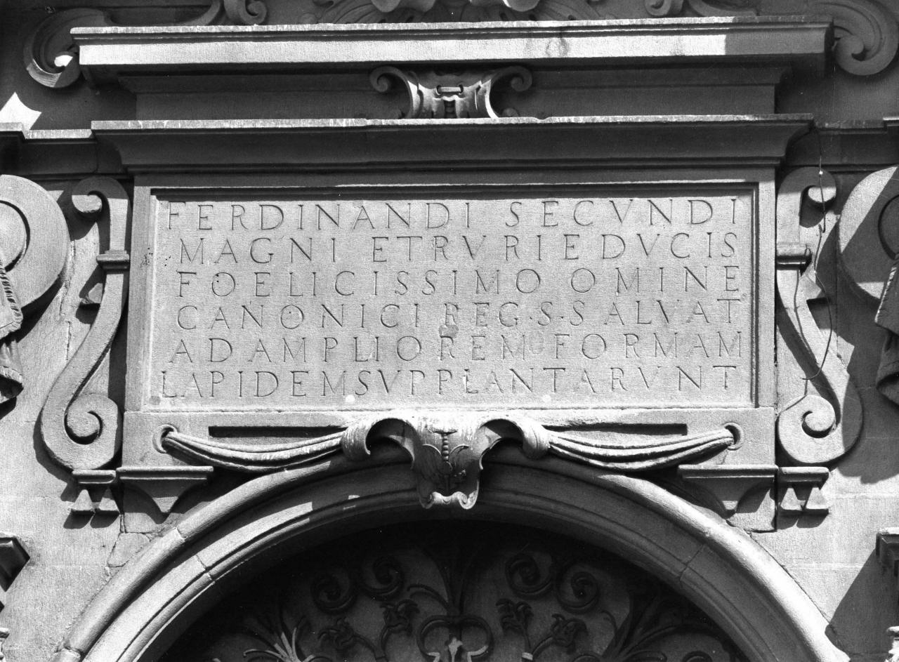 • ISCRIZIONI cartiglio sopra la porta - FERDINANDI SECUNDI/ MAGNI ETRURIE DUCIS/ FOELICISSIMO OMINE/ CANONICI REG. S. SALVAT/ AMPLIOREM FORAM/ LAPIDEM SUPPLANTARUNT - lettere capitali -