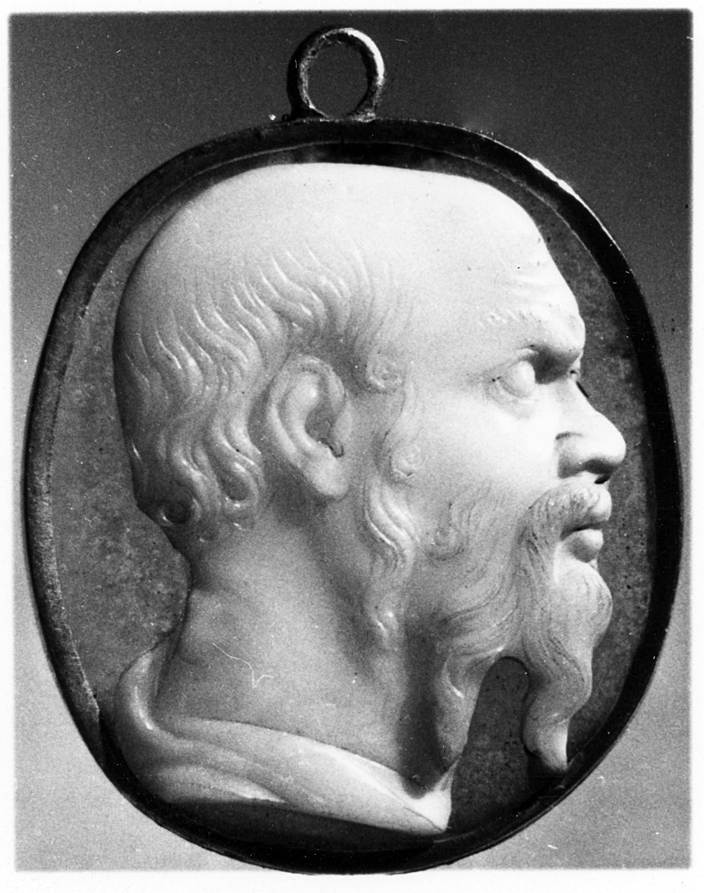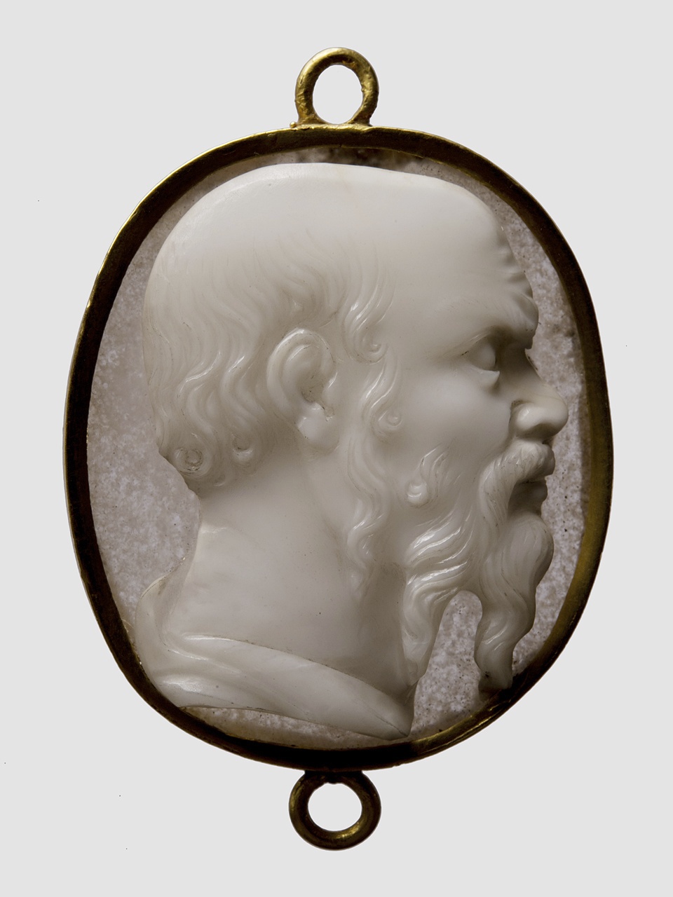 - NOTIZIE STORICO CRITICHE Il cammeo, documentato nelle raccolte granducali fin dai primi decenni del XVIII secolo, fu interpretato dagli antiquari della Galleria degli Uffizi come un ritratto del filosofo Socrate. Tommaso Puccini, che giudicò l'opera di "stile semplice e grandioso" (BdU, ms. 47, n. 205), vi riconobbe la testa di Socrate realizzata dall'incisore Lodovico Marmita, detto anche Lodovico da Parma, ricordata da Giorgio Vasari nella seconda edizione delle Vite all'interno della biografia del più noto Valerio Belli. Stando a quanto riportato dall'artista aretino, questo autore fu attivo a Roma nella prima metà del Cinquecento, dove su incarico del cardinale Giovanni Salviati eseguì alcuni intagli in cristallo di rocca con molte figure, montati in una cassetta d'argento donata dall'alto prelato a Eleonora di Toledo. Proprio alla consorte di Cosimo I si deve, probabilmente, l'acquisizione del cammeo del Museo degli Argenti. Risale infatti al 1556 la notizia di un pagamento effettuato al romano Luigi Maliolo per diverse antichità acquistate dalla duchessa, tra le quali è ricordato anche un cammeo con la testa di Socrate (M. MCCRORY, "Some gems from the Medici Cabinet of the Cinquecento", in "The Burlington Magazine", 917, CXXI, 1979, p. 514, documento 1). Il tipo iconografico risulta diffuso in tutte le più importanti raccolte di glittica. Per altri esempi si vedano gli esemplari nn. 266, 1891, 1926, 1930, 1972, 1931, 2439 dell'inventario Gemme del 1921