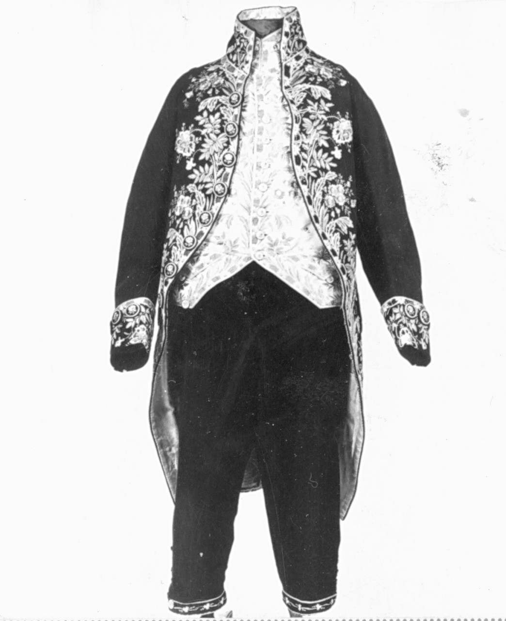 Marsina in lana color marrone testa di moro con colletto verticale, polsini, tasche e code con decorazioni ricamate a filo di seta gialla, azzurra, rosa, verde e pizzo bianco. Sul davanti otto bottoni ricamati con un fiore azzurro e quattro asole corrispondenti ai primi quattro. Sul bordo alto del polsino tre bottoni disposti orizzontalmente; tasche con patte disposte sulla parte alta delle code e tre bottoni visibili . Taglio posteriore a coda di rondine. Ogni coda ha una piega tagliata al centro per tutta la sua lunghezza, con cinque cuciture ad intervalli regolari. Sopra ad ogni coda un bottone, decorazione a fiori, ramoscelli, foglie ricamate e riempite con pizzo, concentrate intorno ai bordi (l'orlo del colletto, i bottoni, le asole, l'orlo in fondo alla marsina, il collo, sopra e sotto le tasche fino alle code). Il pizzo ha una struttura a maglie, tipica del pizzo fiammingo del Settecento. Fodera in seta bianca gros