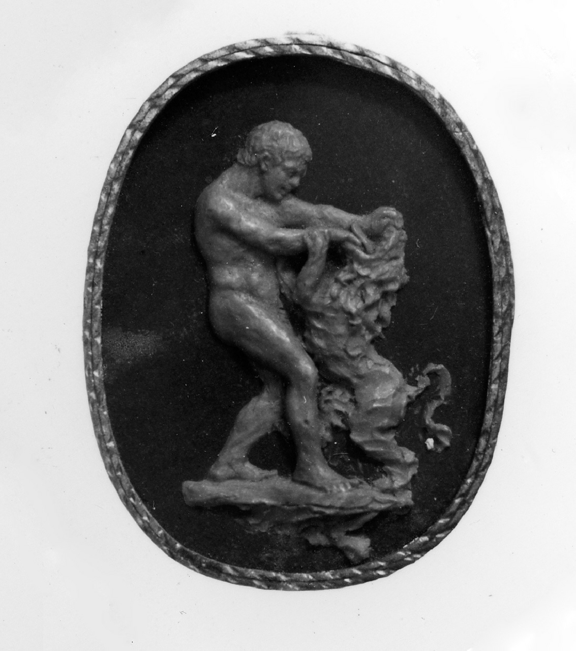 Rilievo in cera rosa su fondo ardesia: Ercole in lotta con il leone Nemeo. Cornicetta in cartoncino dorato