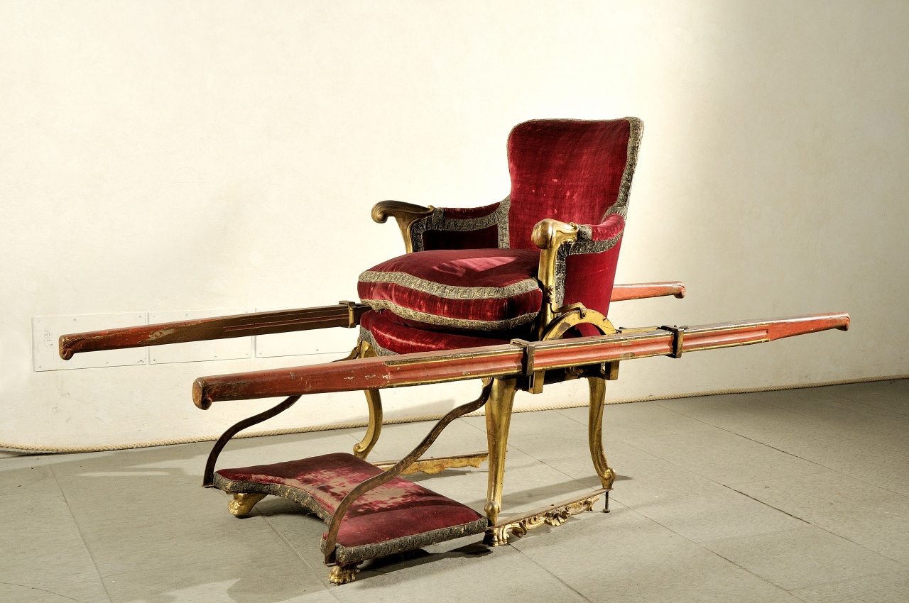 - NOTIZIE STORICO CRITICHE La poltrona fu costruita dal tappezziere Antonio Chelli per la Granduchessa Luisa moglie di Ferdinando III nel 1793, anno in cui viene per la prima volta menzionata nell'Inventario dei mobili di magazzino. La portantina serviva come si ricava dalle voci dei vari inventari seguenti, nelle circostanze dei parti o delle malattie delle granduchesse. Stilisticamente l'oggetto poteva anche far supporre una datazione leggermente più tarda per analogia con lo stile "impero". Fu consegnata al Museo delle Carrozze nel 1922