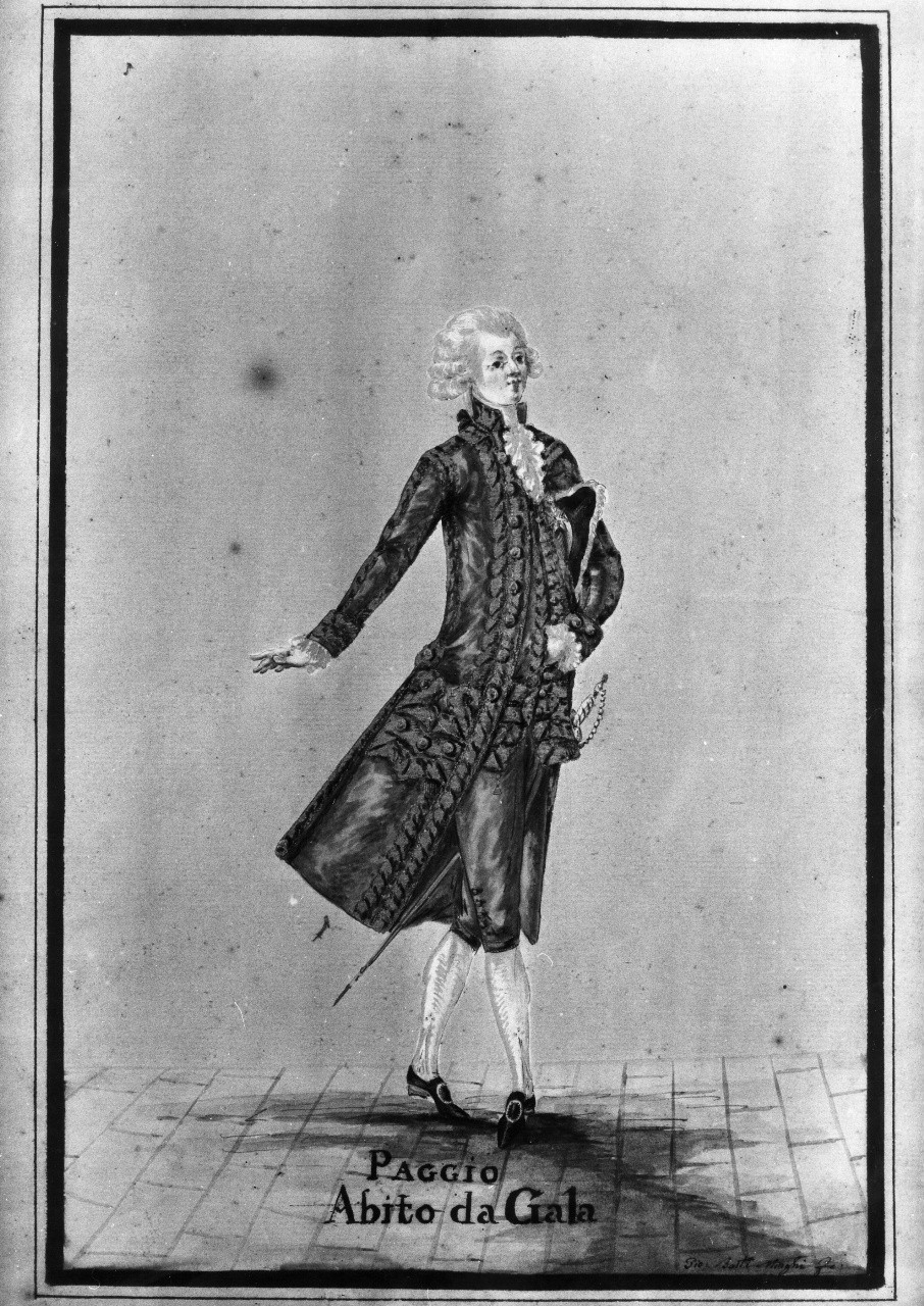 - NOTIZIE STORICO CRITICHE Il disegno fa parte di una serie di 15 figurini, raffiguranti livreati ed uniformati della corte di Ferdinando III di Toscana, eseguiti da Giovan Battista Minghi fra il 1791 ed il 1797. L'autore fu un disegnatore privato, non reperibile nei consueti repertori, che pubblicò numerose serie di figurini destinati ad un pubblico attento agli svolgimenti della moda (vedi: Gazzetta Toscana, 1791, n. 25). L'abito da gran gala veniva vestito dai paggi nelle cerimonie ufficiali. Tutta la serie dei disegni non ha alcun numero d'inventario, ma quattro di essi sono stati identificati nell'inventario del 1846, nn. 4263-4266: quelli con le livree di gala dei cacciatori, la livrea giornaliera dei postiglioni, quella giornaliera dei paggi e la livrea giornaliera degli staffieri. Erano allora nella stanza "che serve d'archivio della segreteria", dove forse erano tenuti a disposizione per l'esecuzione delle livree
