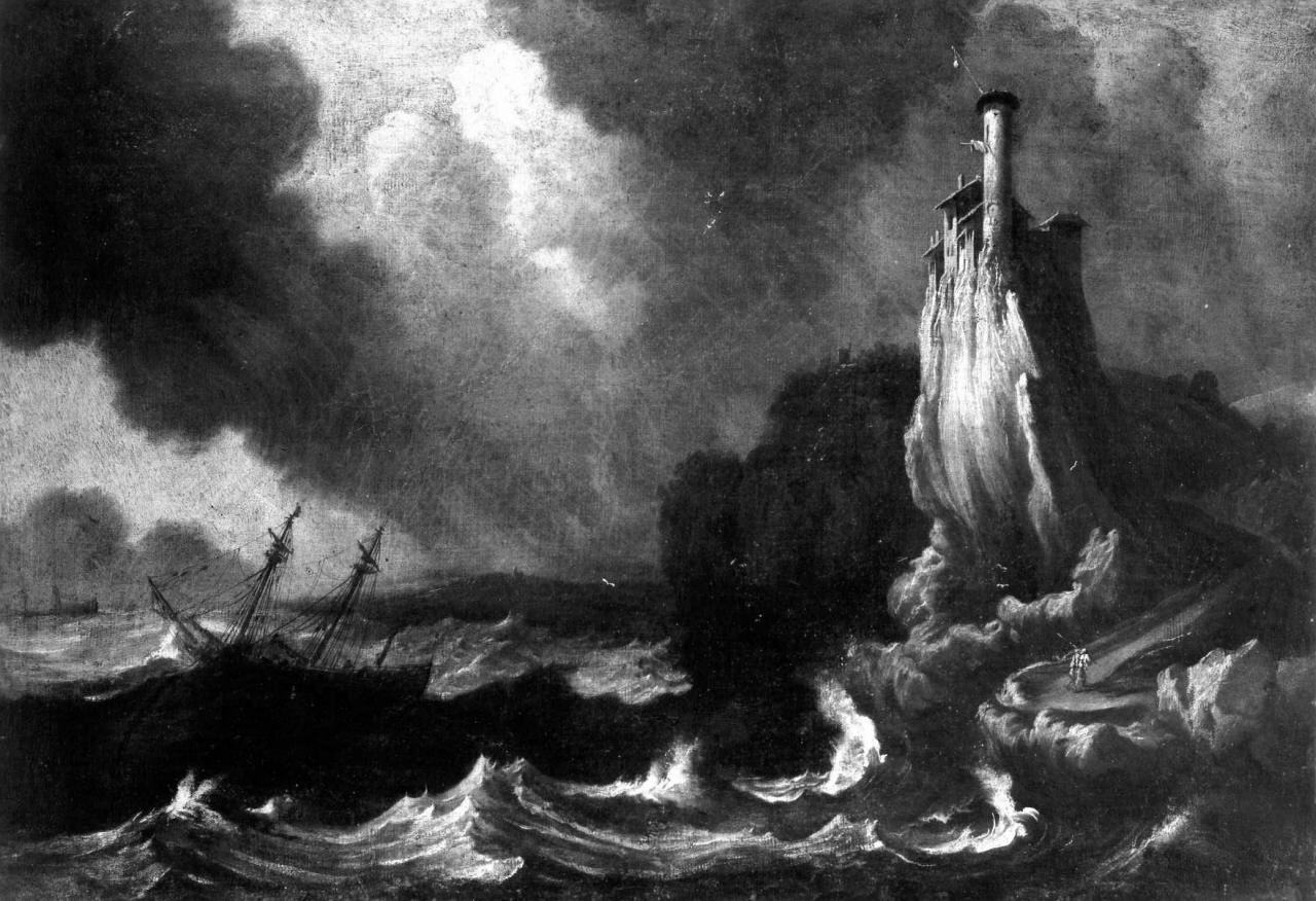 Fenomeni metereologici: burrasca; nubi. Mare. Oggetti: navi; faro