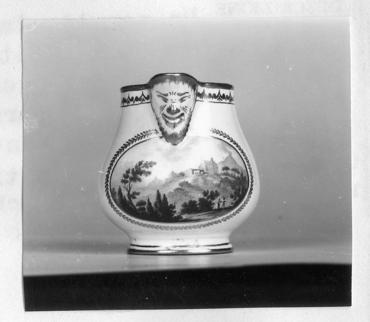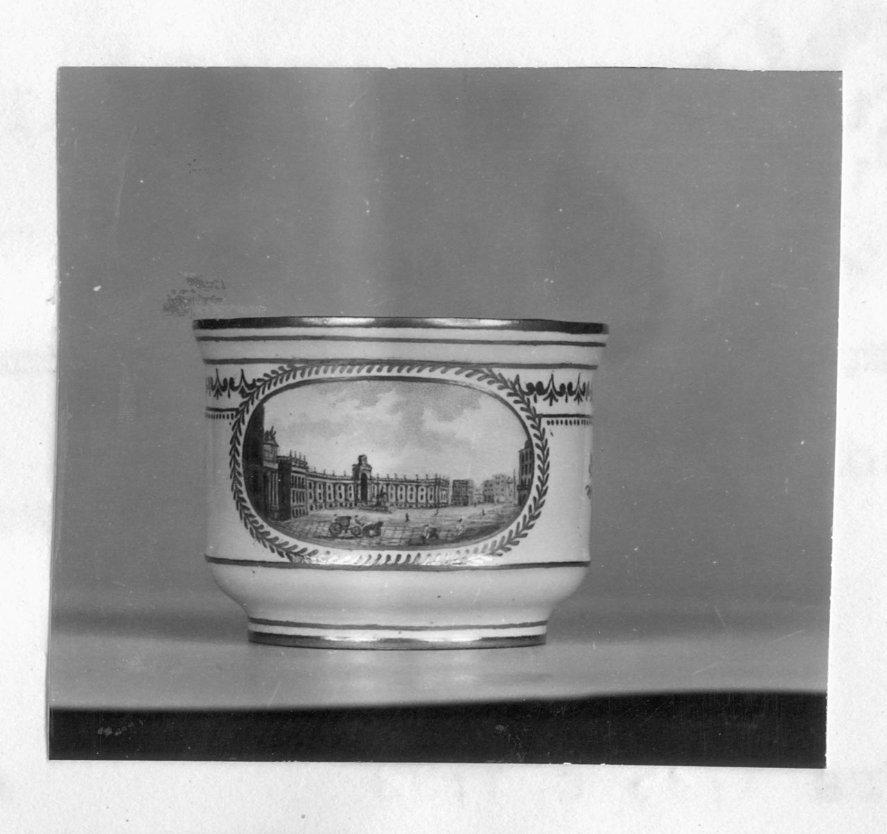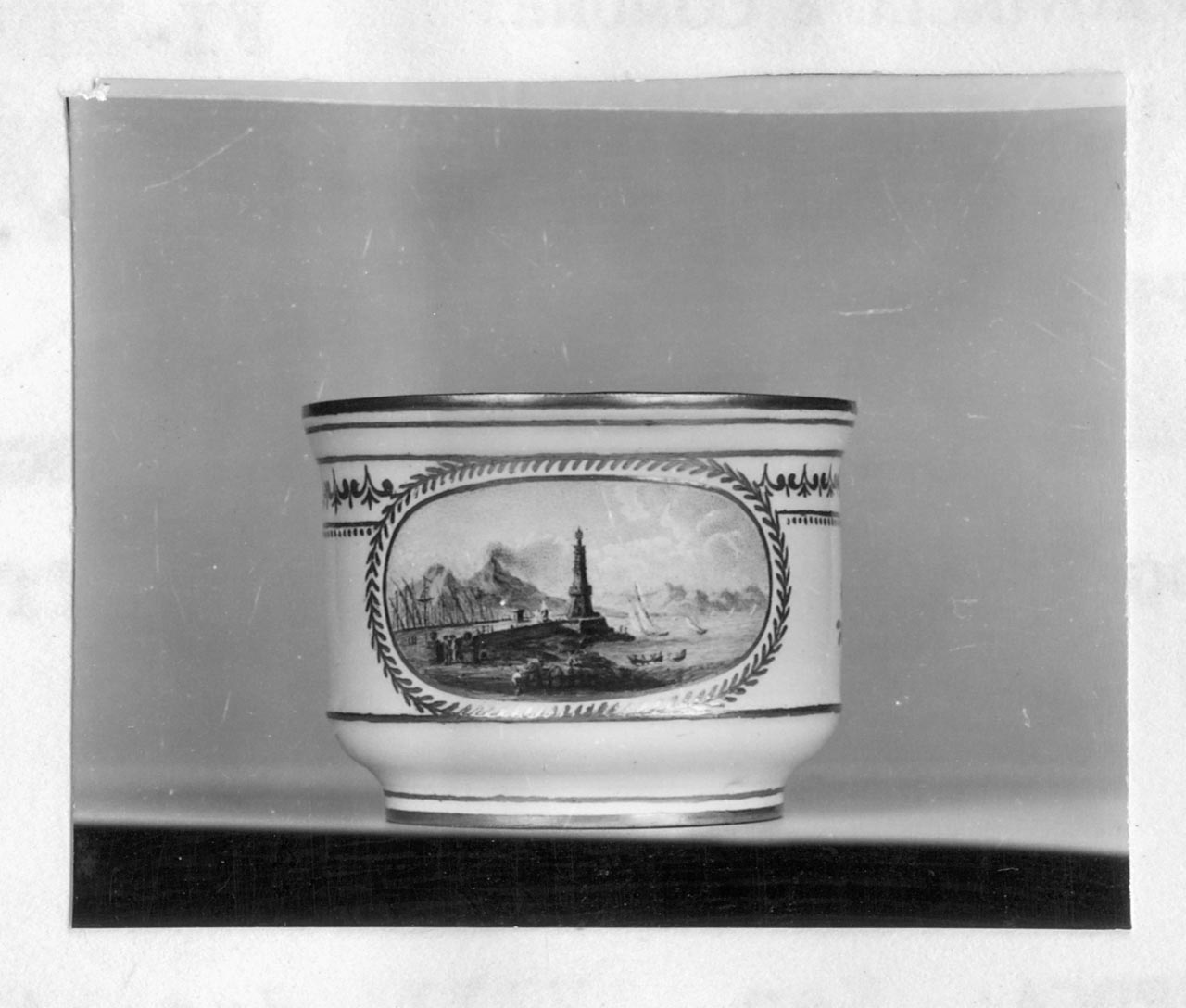 - NOTIZIE STORICO CRITICHE Questo servizio è decorato decorato a vedute policrome entro cartelle. Sotto alcune veduta corre un'iscrizione rosso ruggine. È marcato con la sigla FRF in rosso, fu eseguito negli anni 1785-1788, quando il direttore Venuti mise a punto la porcellana "all'uso di Firenze", vale a dire porcellana dura ricoperta di vernice stannifera. Le forme del servizio sono invece desunte da prototipi di Meissen del 1750 circa e la decorazione a vedute - assai comune nella Reale Fabbrica - deriva dalle incisioni di Nicollet su disegni di Chatelet, riprodotte nell'opera dell'abate di Saint Non "Voyage pittoresque uò Description des Royaumes de Naples et de Sicile", Parigi 1781-1786. Sono riprodotte: la veduta dei campi Elisi presso Pozzuoli sul piattino, la chiesa di San Vitale sulla tazzina, la piazza dello Spirito Santo e la lanterna del Molo di Napoli sulla zuccheriera. Viceversa non sono state ancora identificate le vedute dipinte sulla lattiera e sulla caffettiera