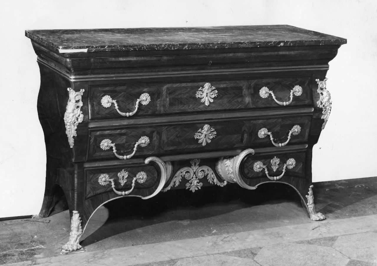 Un cassettone di palissandro con piano di marmo. Ha sei cassetti guarniti di maniglie riccamente lavorate. Ai lati e lungo la parte inferiore 'appliques' in bronzo dorato a forma di mascheroni e larghe volute di foglie d'acanto
