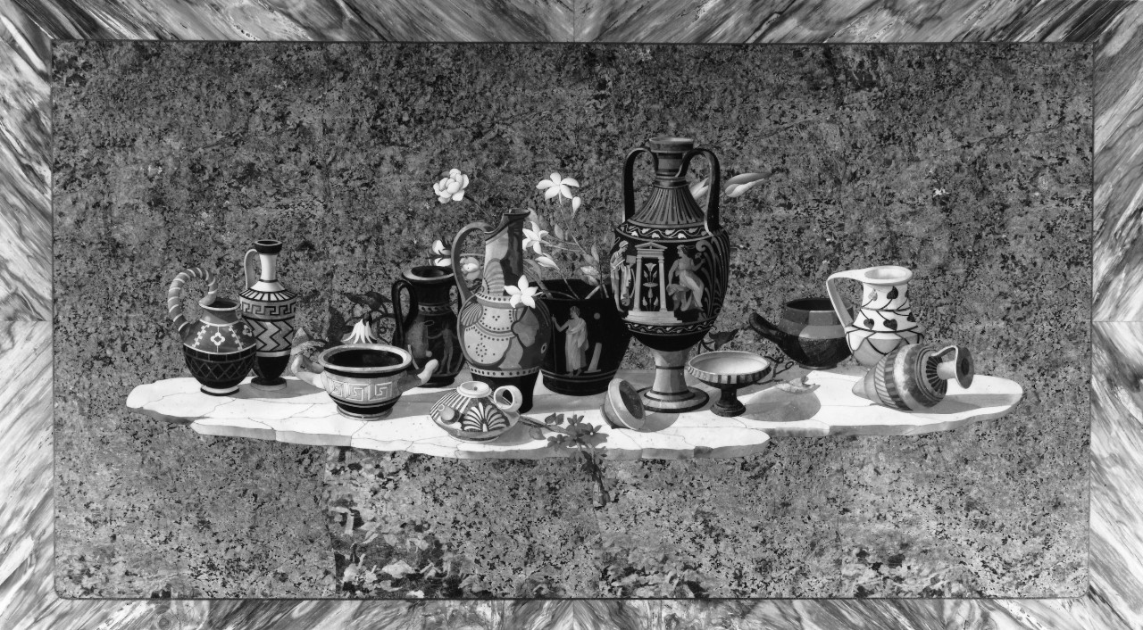 Piano in commesso di pietre dure rappresentante vasi etruschi con al centro un mazzo di fiori