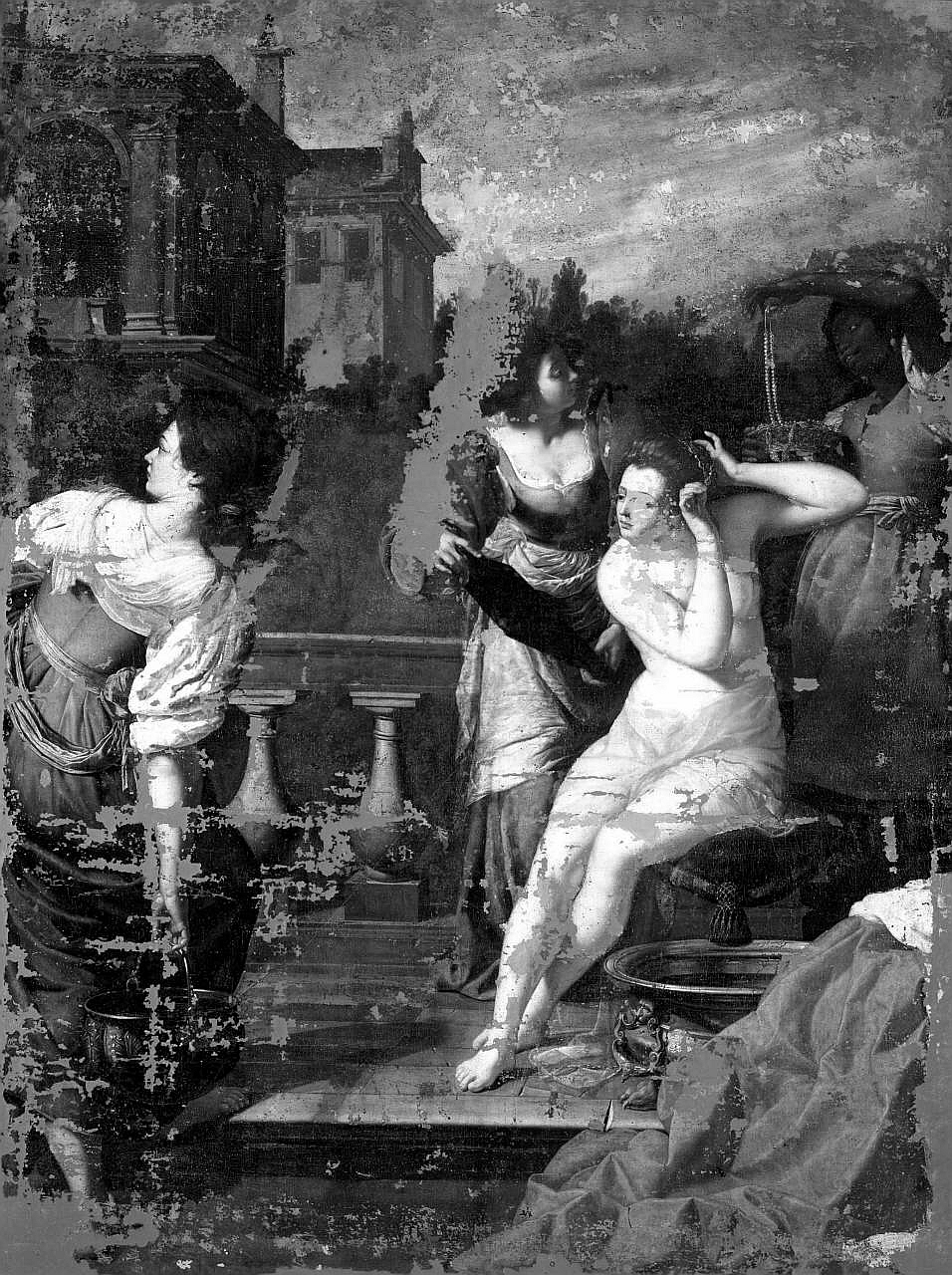- NOTIZIE STORICO CRITICHE Il dipinto raffigurante Bethsabea al bagno, osservata di lontano da re David, si trovava già nelle collezioni medicee granducali quando nel 1663 l'arazziere fiammingo Pietro Fevére ne trasse un arazzo. Si tratta di una delle molteplici versioni di questo soggetto fornite da Artemisia Gentileschi, delle quali una, da considerare replica con poche varianti della presente tela, conservata nel Museo di Postdam e forse proveniente dal Palazzo del Giardino a Parma. Il dipinto ha sofferto molto, probabilmente per essere stato arrotolato e in senso trasversale sono molte le cadute del colore delle quali ha patito.Cadute che permettono tuttavia di godere ancora in parte della buona qualità di quest'opera elegantissima per resa cromatica (con la splendida macchia della ancella di colore), e degli incarnati. Non conosciamo come sia giunto nelle collezioni granducali e non trovano conferma ipotesi di un suo arrivo nel 1635 (cfr. Contini in Artemisia p. 178) o nel 1652 (Gamba in Enciclopedia italiana). Bissel datava il dipinto agli anni tardi di Artemisia, intorno al 1650, per l'interesse decorativo che rivela. La Borea nel catalogo della mostra del 1970, riferiva l'esecuzione del dipinto agli anni fiorentini di Artemisia, quindi intorno al secondo decennio. Di recente Contini (Artemisia) ribadisce una datazione ai primi anni del soggiorno napoletano, poco dopo il 1634
