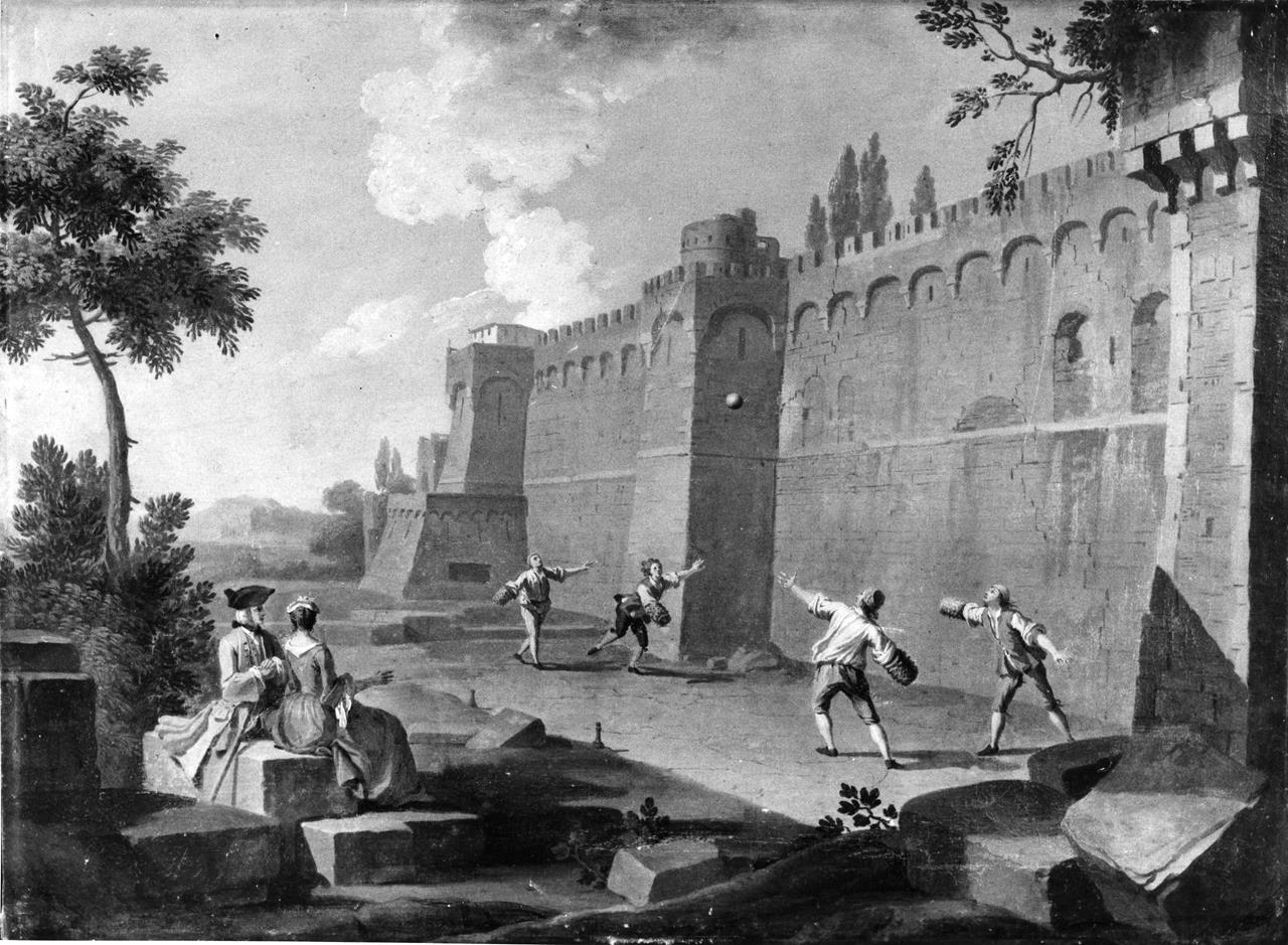 A ridosso di una massiccia costruzione di sapore medievaleggiante, quattro giovan, divisi in due piccole squadre, giocano al pallon grosso (una palla che si deve respingere con il braccio destro armato da una specie di canestratura di vimini), gioco detto anche "della pillotta" o "della pelota", praticato nella Francia meridionale e nei Paesi Bassi. Sotto gli alberi, alla sinistra, una coppia elegante, in costumi settecenteschi, li osserva. Sul fondo un piccolo squarcio paesaggistico, con balze e vegetazione varia