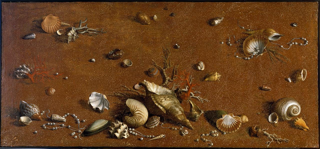 Su un piano omogeneo di colore rosso scuro una tranche fantasiosa del fondo marino: conchiglie e nautili, ostriche e rami di corallo spezzato, nicchi, in una profusione sparsa di perle in guisa di collane e braccialetti abbandonati sul fondo in un fantastico naufragio