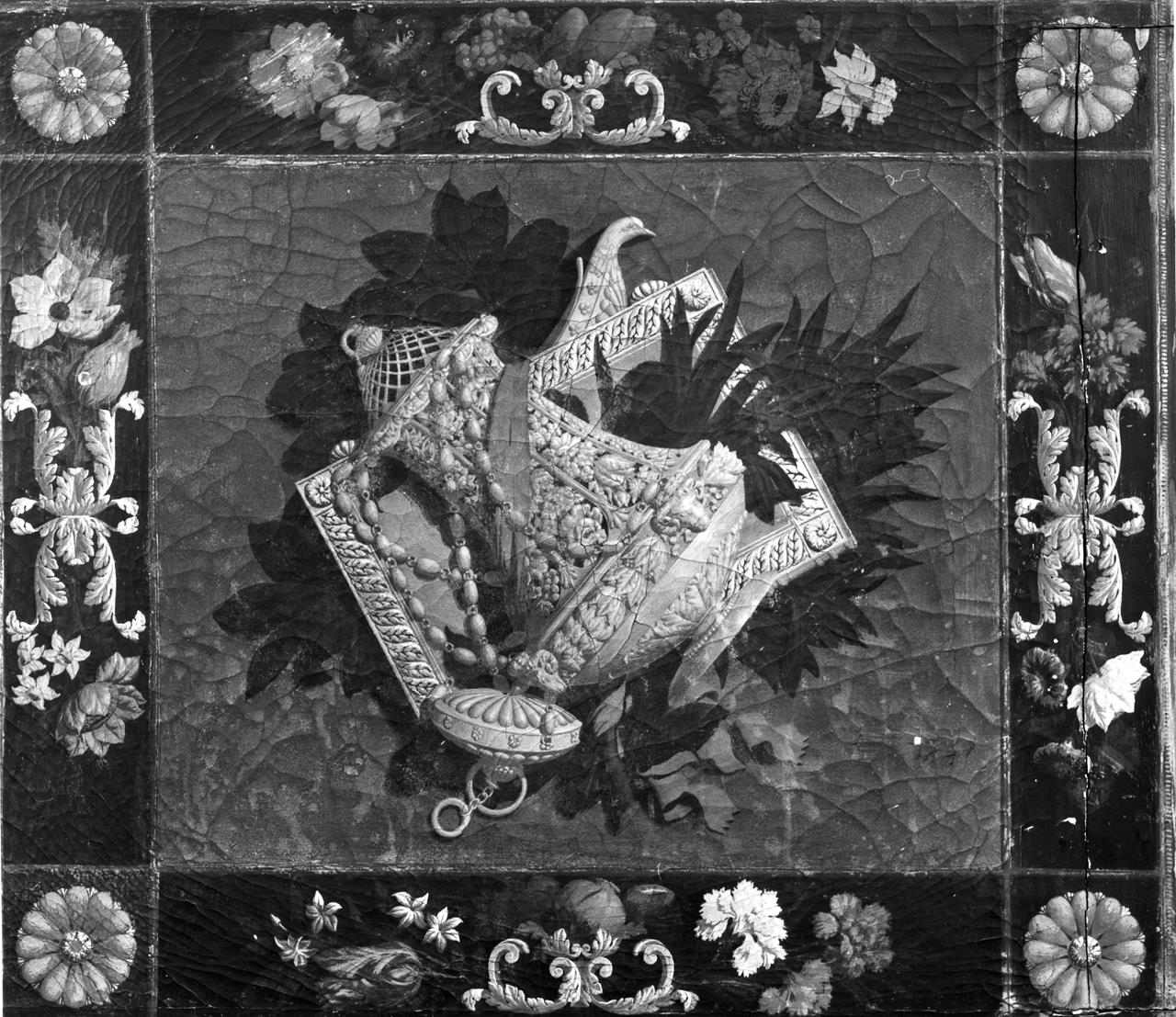 Prezioso turibolo istoriato con intrecci di rigogliosi frutti e fiori. Poggia su un vangelo, arricchito da sovraccoperta con borchie metalliche e cornici istoriate. Cornice a motivi floreali, con borchie angolari. Vivaci, se pure leggermente appannati i colori, mantenuti sul contrasto del rosso con l’azzurro