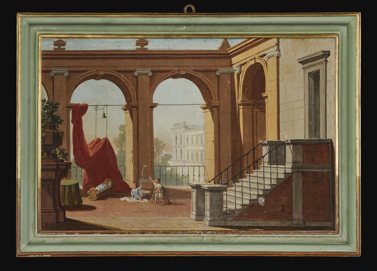 Su una grande terrazza delimitata da arcate di sapore classico, due bambini giocano: uno è seduto e tiene in mano un uccellino legato per una zampa, l’altro partecipa al gioco avanzando in una specie di girello. All’ombra di un drappo, dentro la culla di legno, riposa un neonato. Sulla destra una scalinata conduce nella casa patrizia. Sullo sfondo altri fabbricati e vegetazione varia