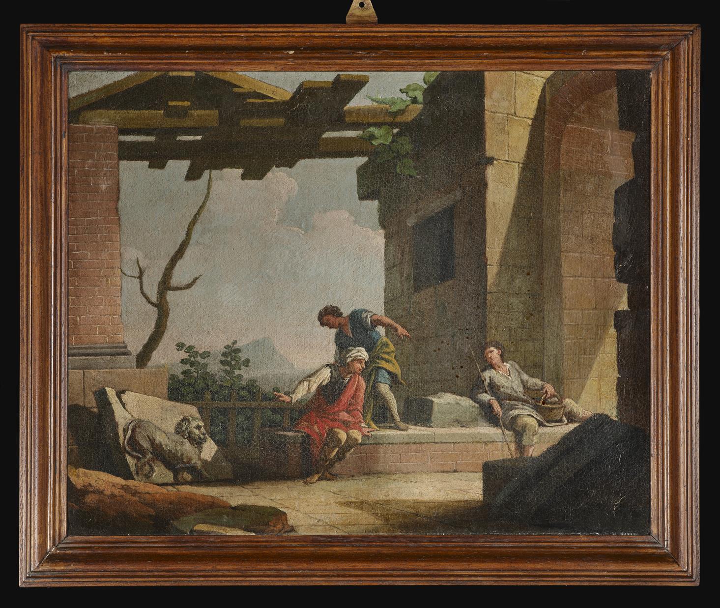 Scena di genere villereccio. Tre contadini riposano nell’atrio di una costruzione rustica e osservano un leone scolpito ad altorilievo su una formella rettangolare appoggiata a un pilastro. All’orizzonte un paesaggio sommariamente tracciato, con picco montuoso
