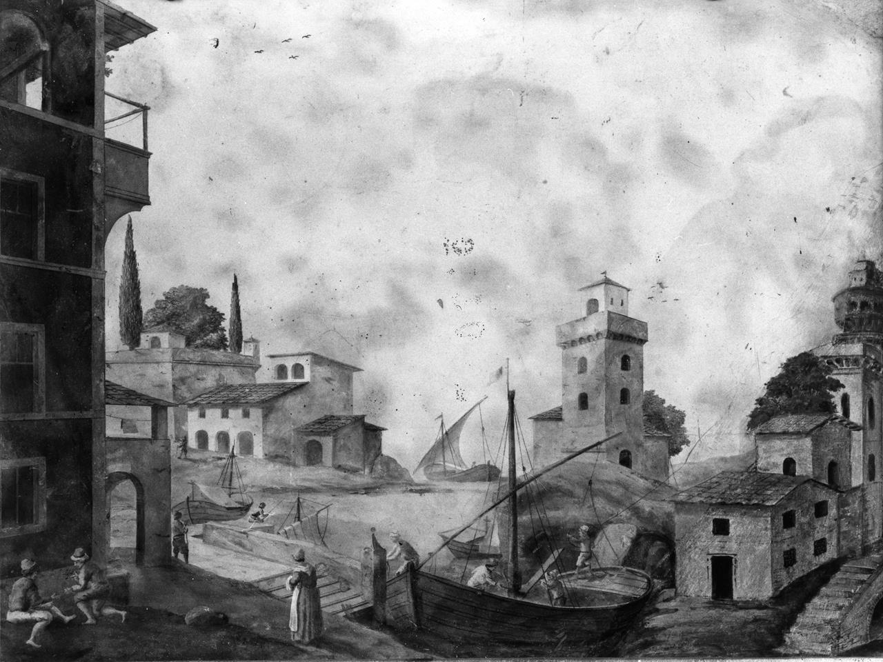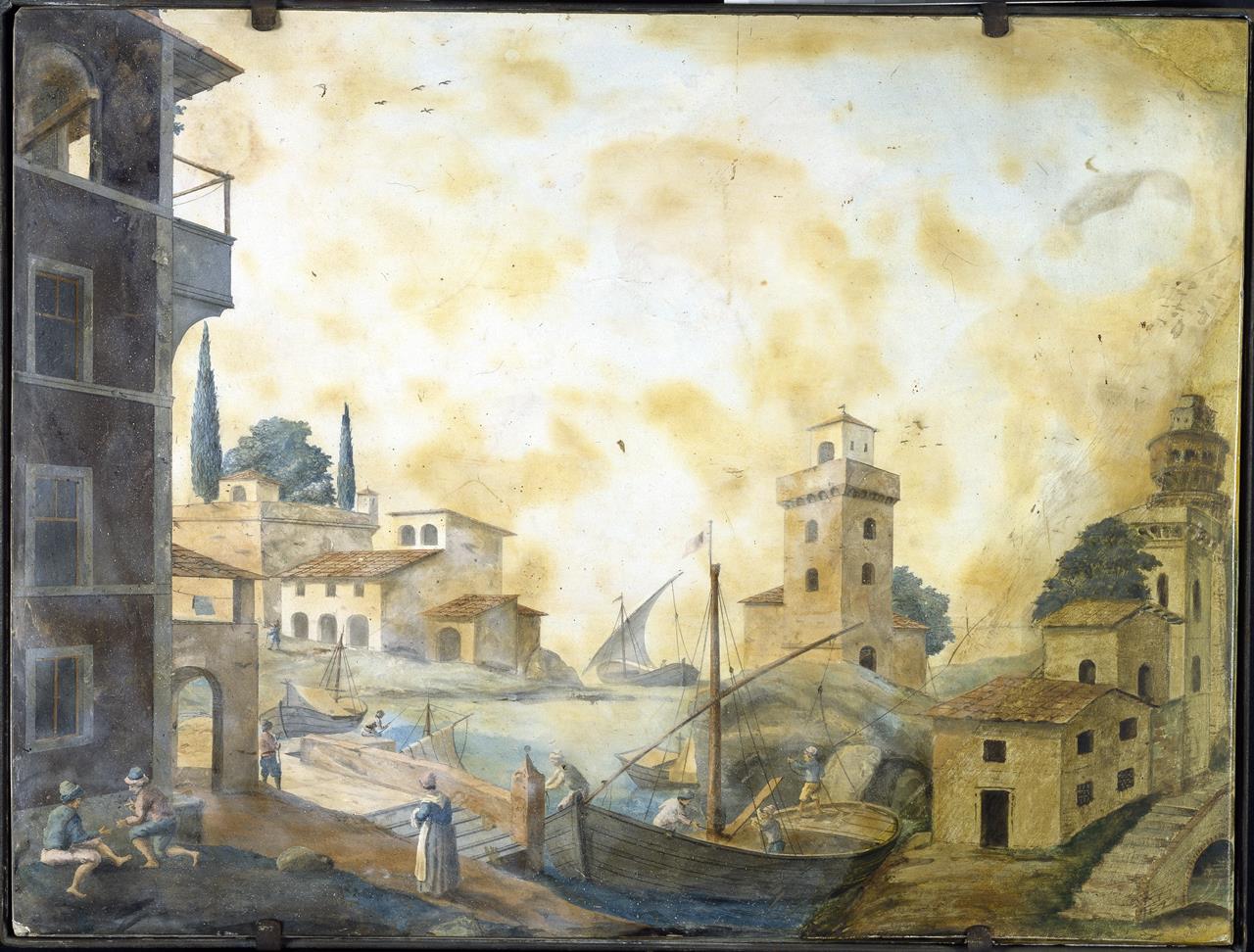- NOTIZIE STORICO CRITICHE Il quadro fa parte di una serie di due coppie di scagliole acquistate dall’Ufficio Esportazione di Firenze il 2 luglio 1952 e, probabilmente, tutte le opere sono da ricondursi ad una stessa paternità, per analogia di soggetto e riferimenti compositivi. Non è azzardato proporre, per le chiare affinità con alcune “vedute fluviali”, conservate presso l’Opificio, la mano di Enrico Hugford, per questa graziosa veduta di porto, in cui prevale uno spirito spiccatamente narrativo. Si veda, per altri confronti atti a suffragare questa ipotesi, una Veduta di porto autografa dello Hugford, conservata presso l’Abbazia di Vallombrosa