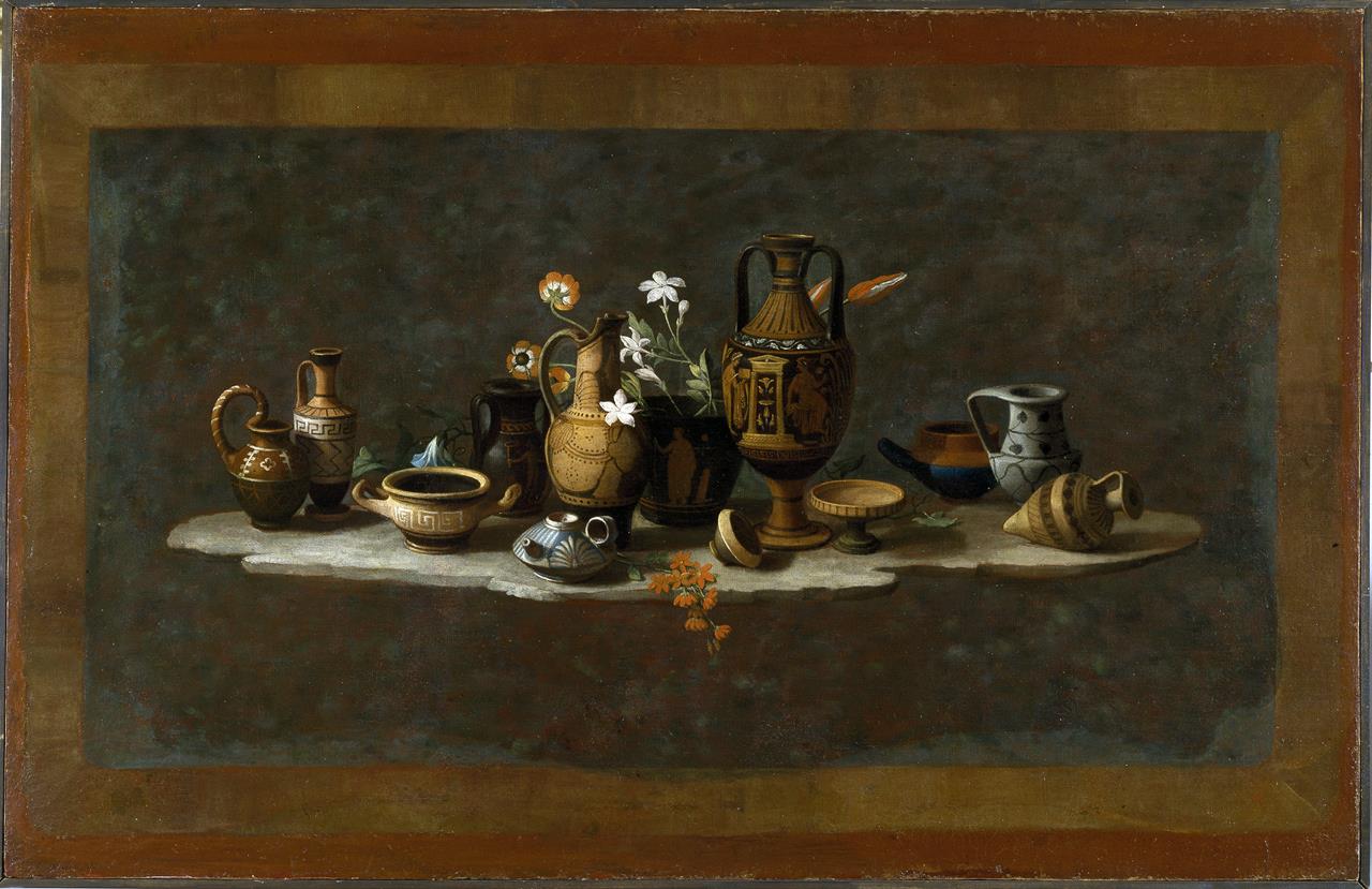 Su un immaginario piano marmoreo, si allineano vari oggetti decorativi: in questo caso abbiamo una serie di suppellettili che si richiamano alla produzione etrusca, anforette, bricchi, patere, cui si accompagnano brani di natura vegetale, ritratti naturalisticamente ma pur sempre con una cifra stilistica del tutto intellettuale che tende ad isolare e a contemplare l’oggetto nei suoi valori plastici e cromatici intrinsechi, del tutto autonomi nel complesso della raffigurazione