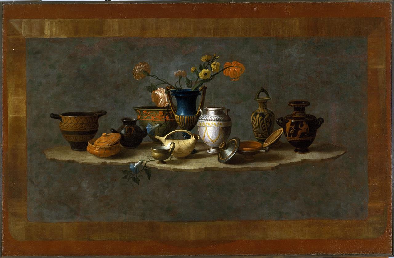Ben poche novità compositive si possono trovare in questo olio, utilizzato come modello per una consolle tuttora conservata nella Sala Ulisse di Palazzo Pitti. Sull’astratto ed irregolare pianale, elemento caratteristico del Cioci, si allineano oggetti di uso, ripresi dalle suppellettili etrusche vividicati dalla presenza di mazzi di fiori