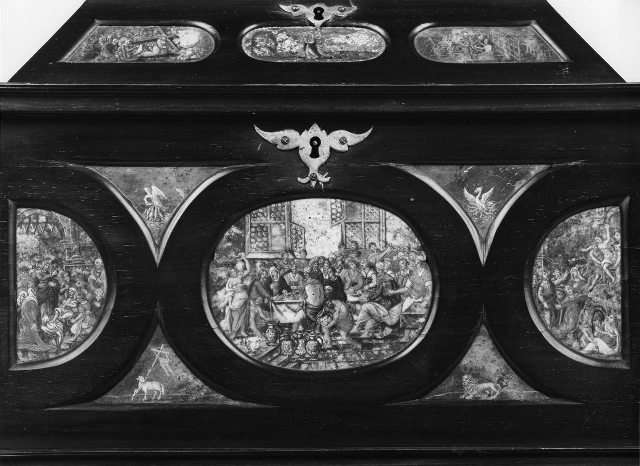 - NOTIZIE STORICO CRITICHE l cofanetto si trovava già nel 1624 fra gli arredi medicei della Villa del Poggio Imperiale. La tipologia generale di questo prezioso oggetto, eseguito con una salda struttura architettonica, la fattura del bronzetto di coronamento e la vivacità delle storiette dipinte, trovano notevoli analogie stilistico-compositive in lavori di manifattura tedesca, quali, ad esempio, un cofanetto eseguito ad Augusta, datato 1631 ed oggi conservato presso il Rijksmuseum di Amsterdam. Mentre in Italia il genere della pittura su pietra che, manieristicamente, unisce i due concetti di artificio e natura, si sviluppa soprattutto in opere a se stanti, spesso riunite in vere e proprie collezioni (vedi quella di Cosimo II de’ Medici) in ambiente germanico troviamo molto più diffusa l’applicazione di questi lavori a stipi, cofani ed altre suppellettili prodotte dalle locali botteghe di ebanisti. La voga artistica del dipinto su pietra tocca l’apice dello sviluppo nella prima metà del ‘600