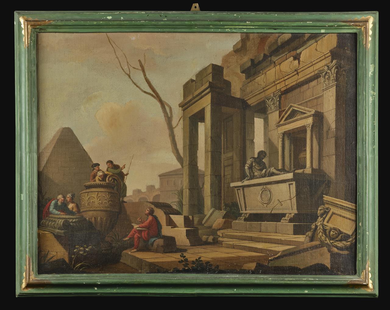 In un paesaggio decisamente urbano viene collocato un campionario completo di solenni ruderi: a sinistra una austera piramide, quindi un’urna cineraria decoratissima di sapore vagamente ellenistico, quindi sulla destra, costruzioni trabeate con decorazioni di pura classicità. Nel paesaggio sostano alcuni personaggi: una coppia, sulla sinistra, emerge da un’urna-sarcofago di sapore etrusco, altri tre personaggi prendono posto nel monumentale vaso cinerario, un giovane, in posizione centrale, seduto su un sasso rettangolare è intento a cercare l’ispirazione: impugna la penna e guarda verso l’alto