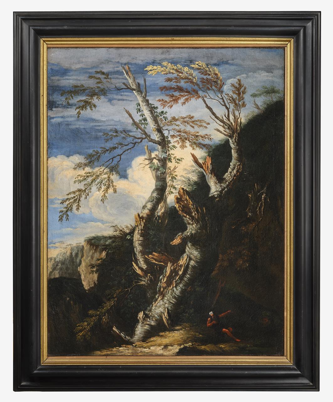 - NOTIZIE STORICO CRITICHE Il dipinto fa coppia con un altro olio, di analogo soggetto, che figura già nell’Inventario del 1789. Lo stato di conservazione, piuttosto mediocre, impedisce evidentemente un giudizio definitivo circa la reale consistenza della loro qualità pittorica, ma non tanto da non suggerirne l’evidente accostamento con la produzione tarda di Salvator Rosa, cui riconduce il chiaro-scuro dettato da un intento fortemente emotivo che sottolinea il mistero sublime e minaccioso della natura, le notazioni naturalistiche che si accompagnano allo evocazione di uno stato bizzarro, ad una misurata elaborazione fantastica