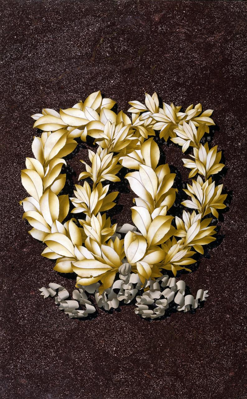 - NOTIZIE STORICO CRITICHE Di questa elegante formella scrive lo Zobi riferendosi ai lavori che si facevano presso l’Opificio nel tentativo di realizzare l’altare della Cappella dei Principi. Tra le varie decorazioni su cui si sofferma, citando questa opera, scrive “...ove tra le altre rarità meritano di essere osservate altre due formelle di porfido rosso, con entro una doppia ghirlanda di lauro e d’olivo eseguite col diaspro giallo sfumato di Volterra, come se fossesi voluto raffigurare de’ bassorilievi, mentre sono di commesso in piano”. Come si può chiaramente vedere dallo stile neoclassico la formella appare attardata rispetto alla data di esecuzione, 1849, richiamandosi piuttosto a una tipologia caratteristica dei manufatti di circa un trentennio prima. Ciò è dovuto al lasso di tempo intercorso tra la realizzazione del disegno, eseguito da Giovan Battista Giorgi circa nel 1820, e la traduzione in commesso di pietre dure, intervallo dovuto alle diverse modifiche del progetto complessivo. Per cui la elegante formella, terminata nel 1849, è stilisticamente molto affine ai piani di tavolo con fondo di porfido e diaspro a sfumo eseguiti verso il 1820. La formella in esame appare inserita nel disegno per l’altare del 1860
