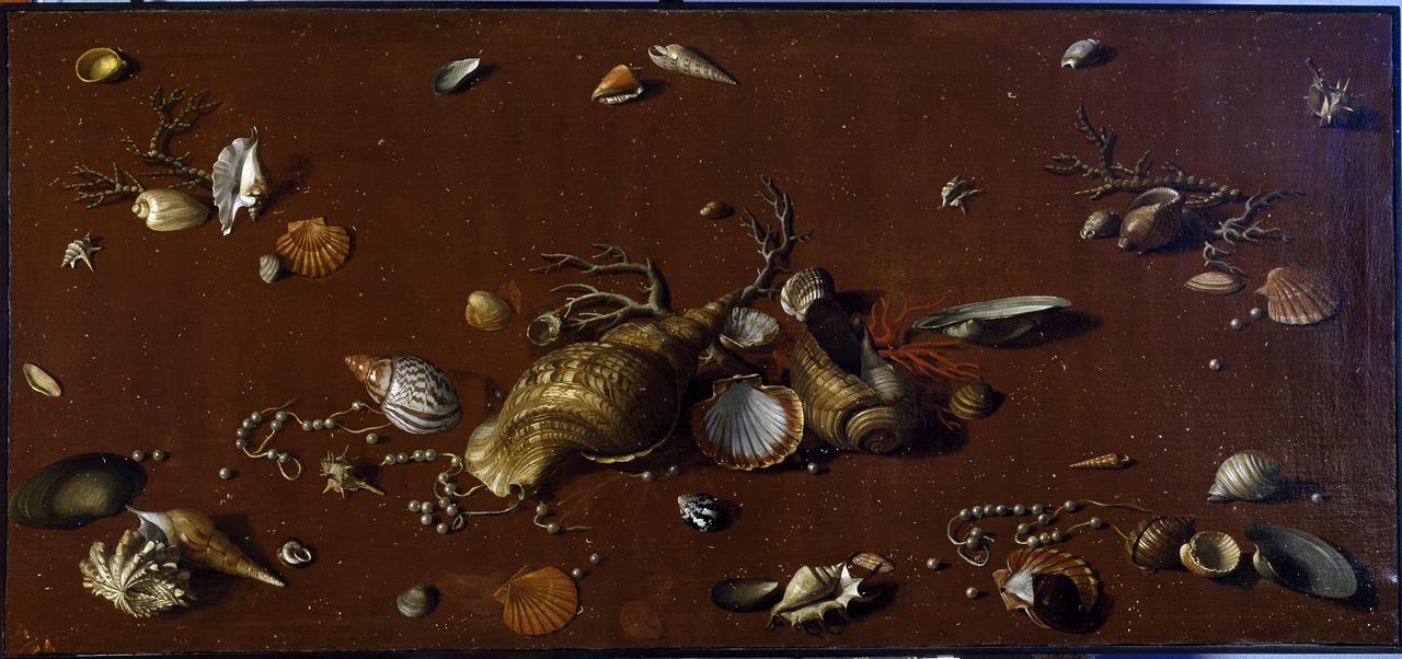 L’astratto fondo di colore granata intenso accoglie in ordine sparso varie valve di conchiglie, nicchi scelti tra i più preziosi oggetti del fondo marino. Accuratissima la composizione delle forme, dai pinnacoli dei nautili appoggiati sui coralli, alle conchiglie screziate, ricche di luminosità crema. Fili di perle e perle sparse accendono di toni opalescenti la generale gamma cromatica rosata