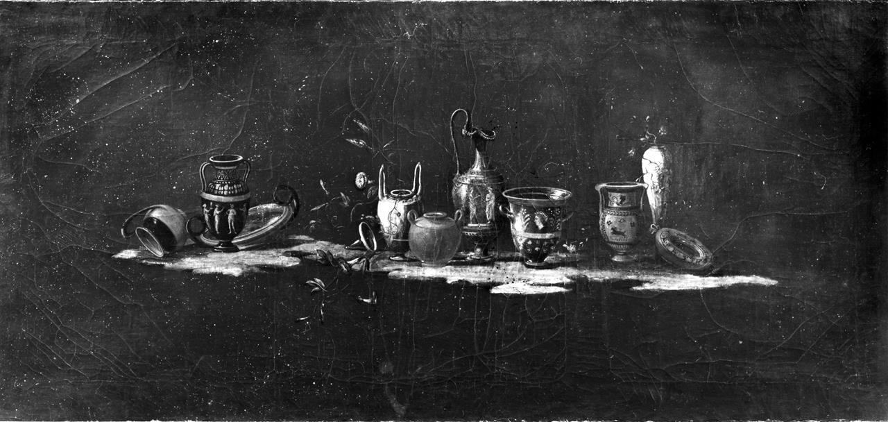 - NOTIZIE STORICO CRITICHE Il modello, insieme ad un altro di analogo soggetto, eseguito come olio preparatorio per una coppia di piani di consoles a commesso di pietre dure in fondo di porfido, attualmente conservate nella Sala di Apollo di Palazzo Pitti, piani la cui lavorazione era già in corso nel 1783 (A.S.F., I. e R. Corte Lorenese, filza 2374, c. 163), come si legge in una nota della Segreteria di Corte indirizzata il 2 dicembre di quell’anno a Cosimo Siries, da cui si apprende anche che lo stesso re di Svezia, Gustavo III, era rimasto colpito dalla bellezza delle due tavole in fondo di porfido che stavano eseguendo presso la Galleria dei Lavori. Con la realizzazione di questi due piani di consoles si determina una svolta importante all’interno della produzione della Galleria dei Lavori che, dopo circa un ventennio, abbandona i soggetti di figura in favore di tematiche più sofisticate ed astratte: un gusto nuovo che si protrae fino alla metà dell’ 800 e che dà il definitivo addio al vedutismo che tanto aveva imperato nel corso del secolo XVIII e alla cui diffusione deve aver contribuito sostanzialmente Luigi Siries e, soprattutto, Antonio Cioci che, proprio verso la fine degli anni ‘70, porta a piena maturazione un processo di razionalizzazione dell’oggetto raffigurato in una sua resa lucida ed astratta, processo già iniziato con le nature morte del decennio precedente e portato avanti con illuministica curiosità