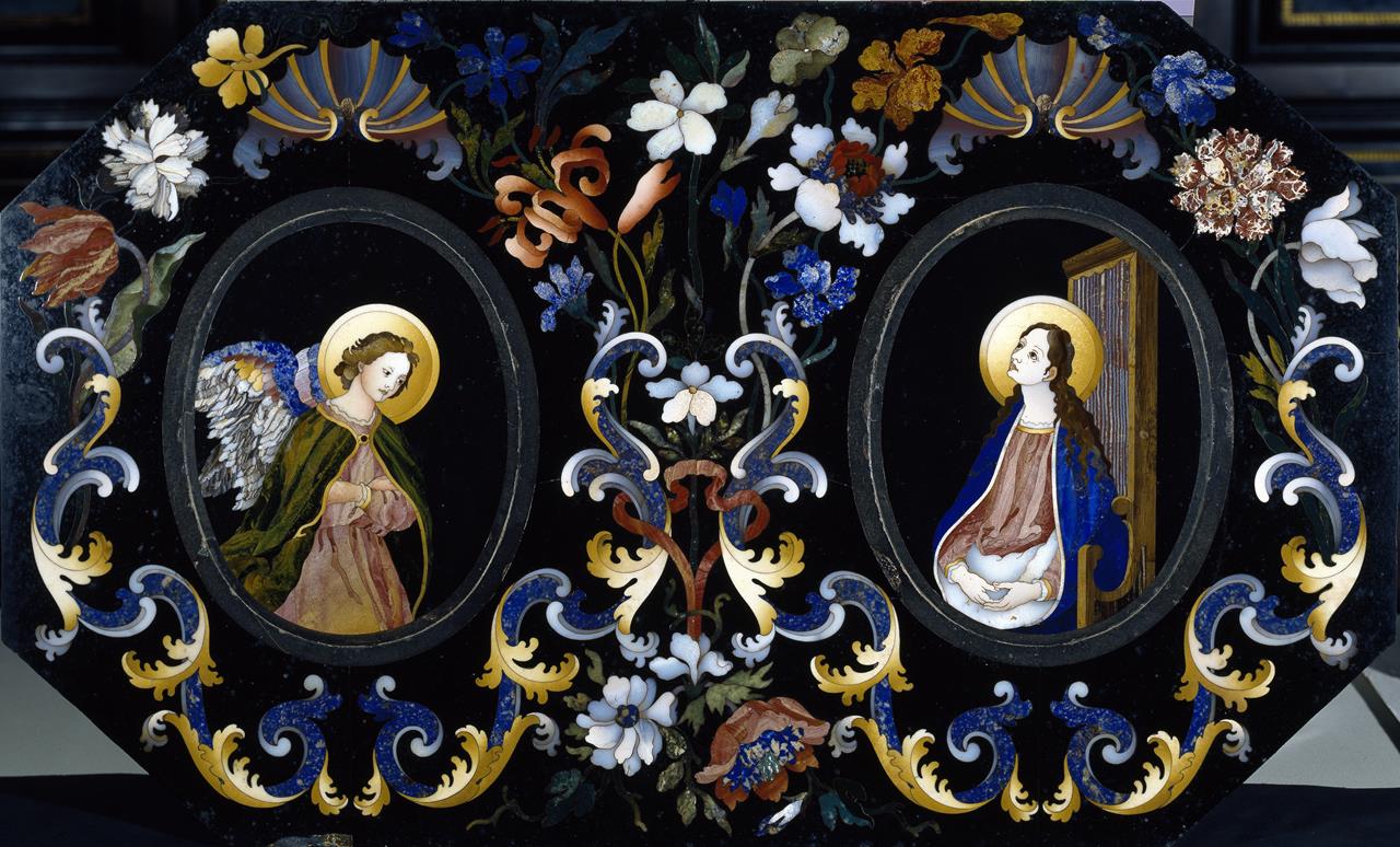 - NOTIZIE STORICO CRITICHE L’opera è firmata e datata da Baccio Cappelli, artista attivo sotto il regno di Gian Gastone. Per quanto il Marchionni, nella sua guida del 1891, ritenga che questa opera sia stata eseguita su disegni del Poccetti, la critica è piuttosto orientata sui disegni di Giovan Battista Foggini, soprattutto sulla base di opere analoghe. Il soggetto dell’Annunciazione, tema da sempre caro all’arte fiorentina, incontrò particolare favore nella prima metà del secolo XVIII con opere in pietre dure e bronzo dorato ispirate ai disegni del Foggini e di Giuseppe Antonio Torricelli (1659-1719). anche in questa formella con i due ovati lavorati in piano, contrariamente al metodo più usato di lavorazione a basso rilievo, la stessa ricca cornice di fiori e decorazioni in pietre dure, è motivo ricorrente nei disegni del Foggini. Da notare la finezza esecutiva che si esprime, ad esempio, nelle screziature bianche e rosse del garofano in alto a destra, rese con il diaspro fiorito di Sicilia, nelle sfumature rosse e gialle del tulipano, eseguito con il diaspro di Alsazia