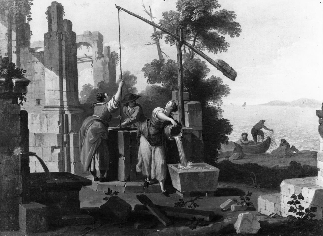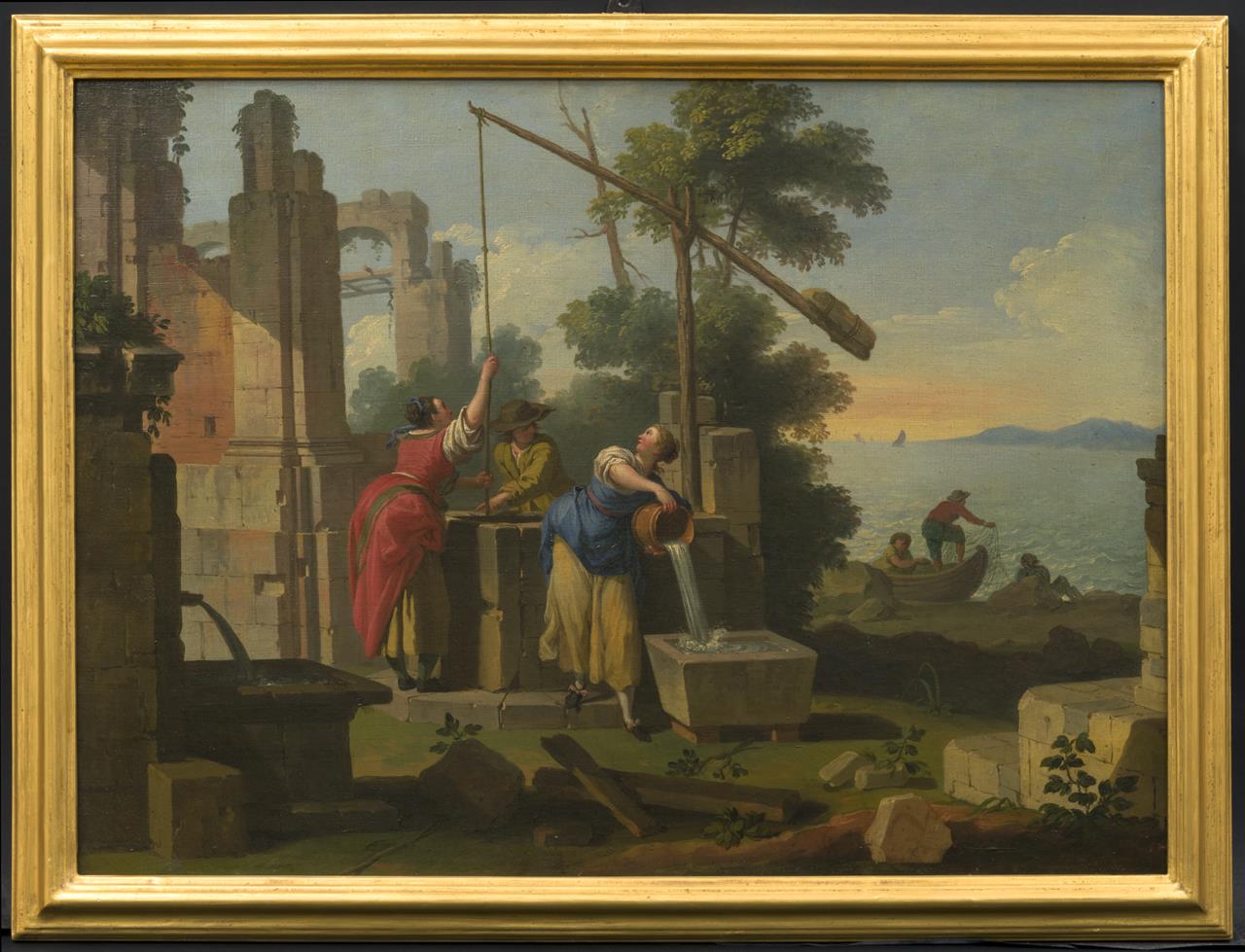 In posizione centrale una coppia di donne ed un uomo con il cappello dalle larghe tese che attingono acqua da un pozzo. Sulla destra si apre il mare, verosimilmente un golfo, visto che dall’altra parte si intravede un promontorio accennato tra le nebbie ed una barca di pescatori che gettano o raccolgono le reti