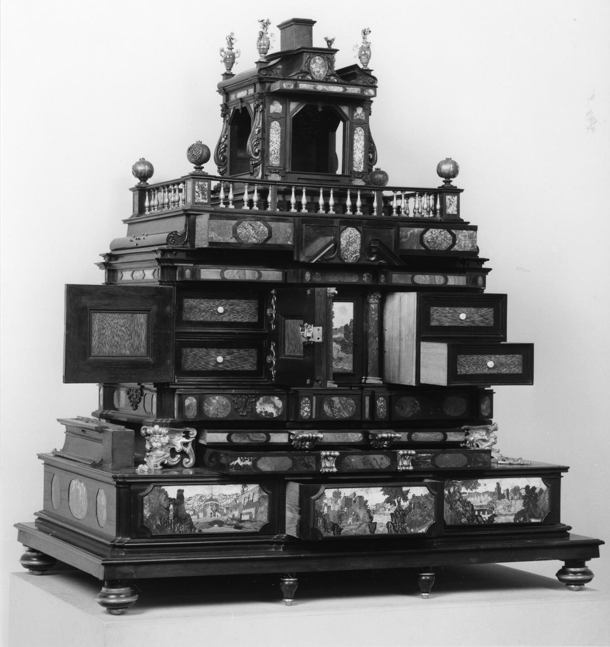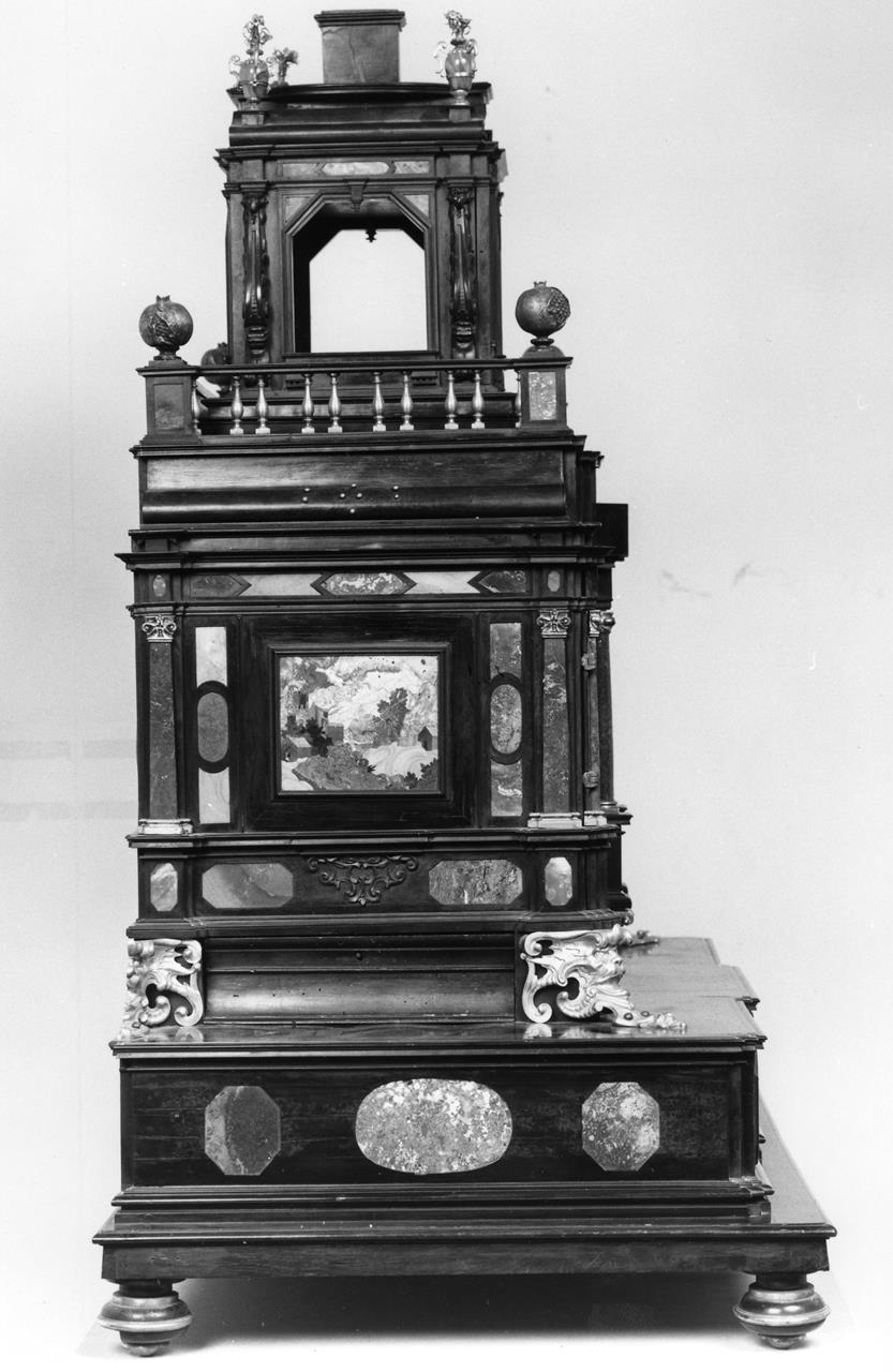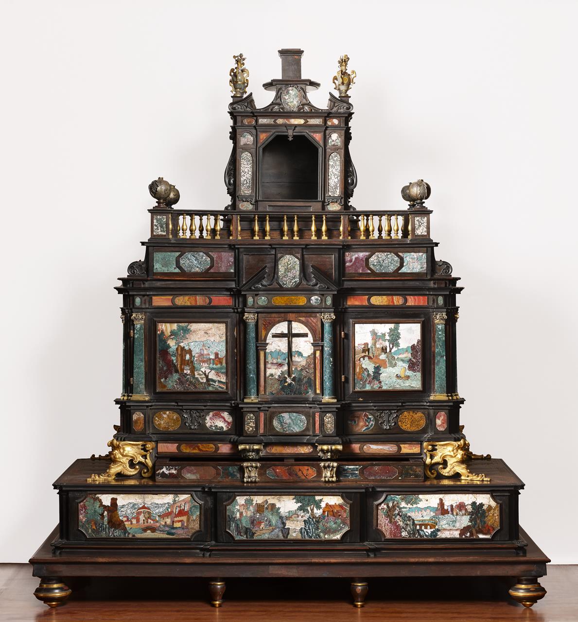 Stipo eseguito in ebano intarsiato, di particolare complessità. Presenta un andamento genericamente piramidale, con larga base rettangolare, decorata da formelle in commesso di pietre dure, tutte raffiguranti paesaggi di ispirazione fantastica. Nella parte mediana si aprono piccoli cassetti, destinati alla custodia di oggetti di valore. Nella parte alta una piccola balaustra decorata con colonnine ed un baldacchino finale ornato da quattro vasetti eseguiti in agata. Presenta inoltre, nella parte inferiore, quattro peducci angolari a foggia di mascheroni in bronzo dorato di gusto neo-manieristico