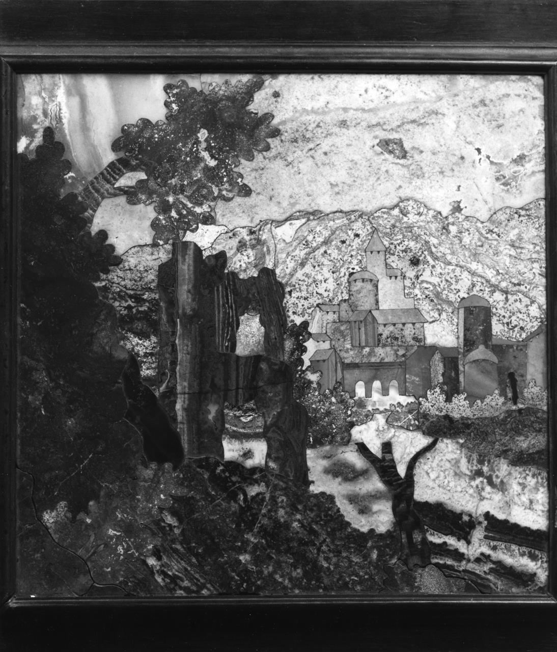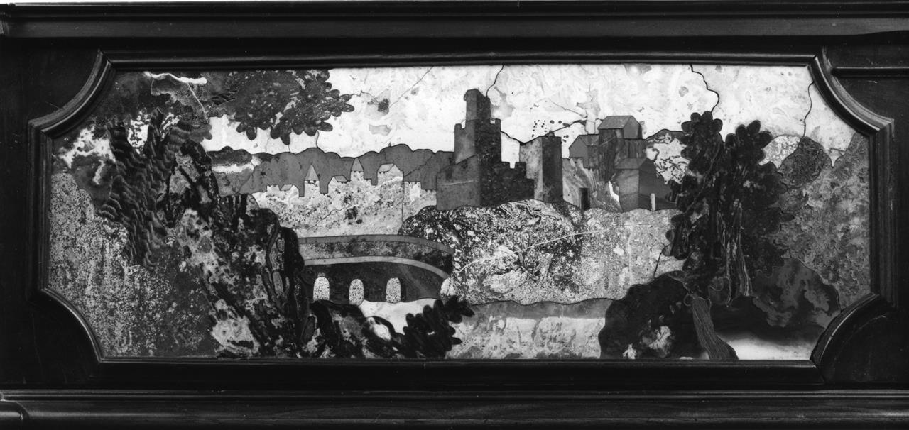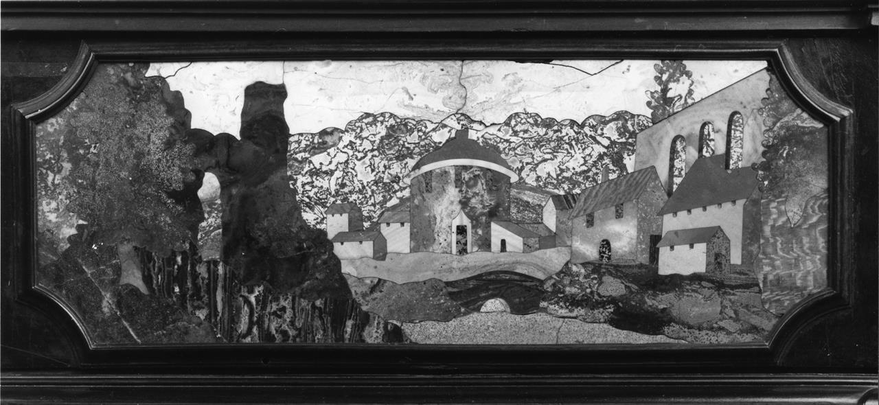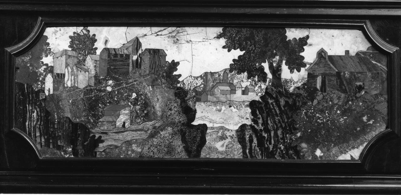 Stipo eseguito in ebano intarsiato, di particolare complessità. Presenta un andamento genericamente piramidale, con larga base rettangolare, decorata da formelle in commesso di pietre dure, tutte raffiguranti paesaggi di ispirazione fantastica. Nella parte mediana si aprono piccoli cassetti, destinati alla custodia di oggetti di valore. Nella parte alta una piccola balaustra decorata con colonnine ed un baldacchino finale ornato da quattro vasetti eseguiti in agata. Presenta inoltre, nella parte inferiore, quattro peducci angolari a foggia di mascheroni in bronzo dorato di gusto neo-manieristico