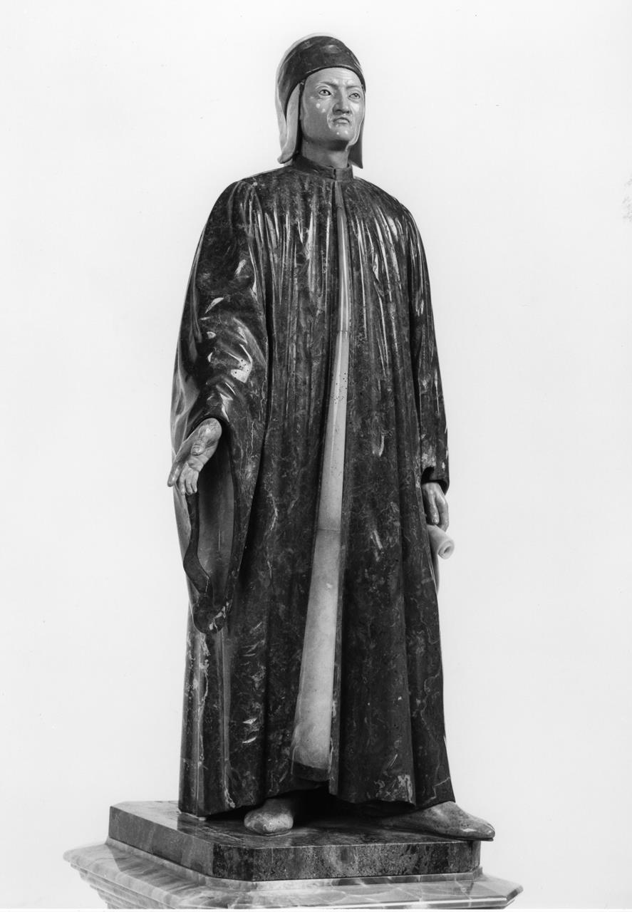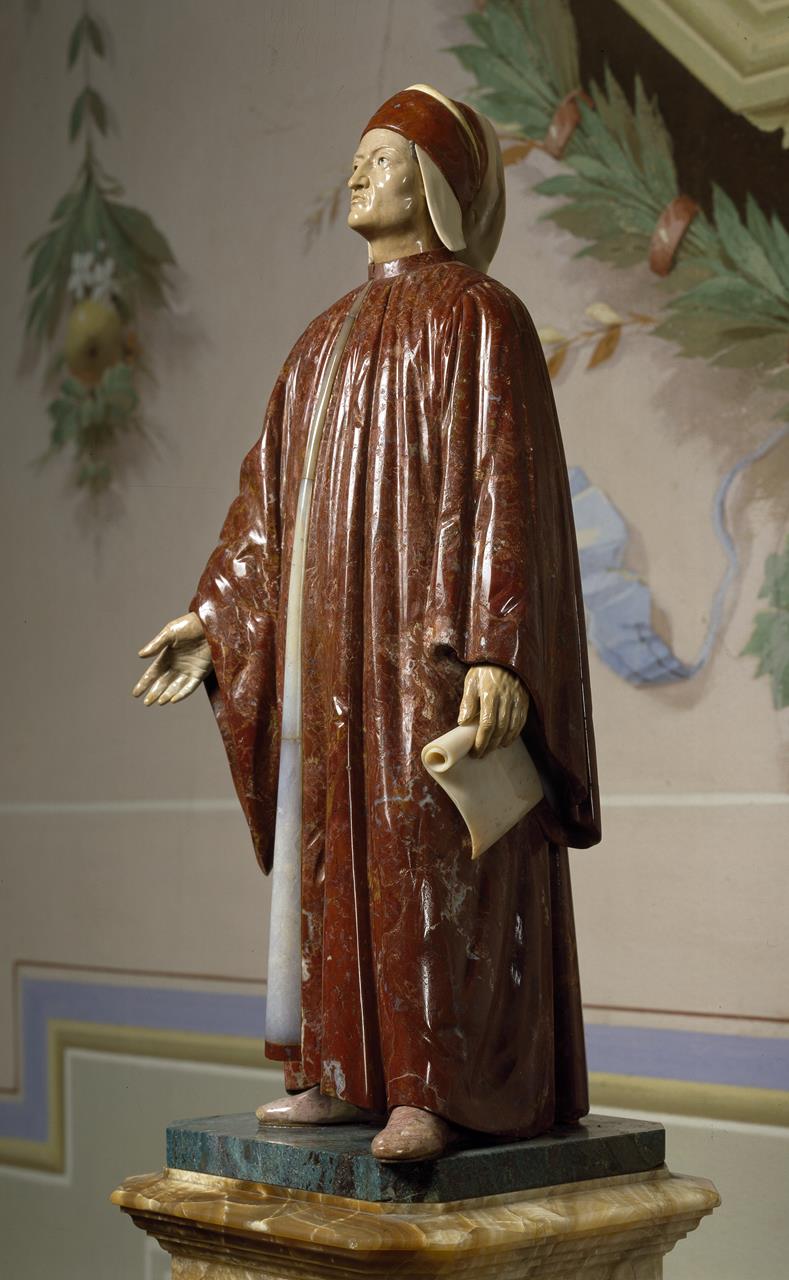 Statuetta a tutto tondo raffigurante Dante in missione di ambasciatore presso papa Bonifacio VIII. La statuetta è eseguita in calcedonio orientale come se si trattasse di un monumento in scala ridotta ed è decorata da formelle polilobate, di gusto goticizzante, raffiguranti le arme degli Alighieri, il giglio fiore e la corona di lauro del poeta. Dante vi è ritratto in posizione perfettamente frontale, con la palandrana ed il cappuccio propri dell’iconografia tradizionale, il volto serioso e tirato. Nella mano sinistra porta una pergamena, simbolo della sua missione diplomatica