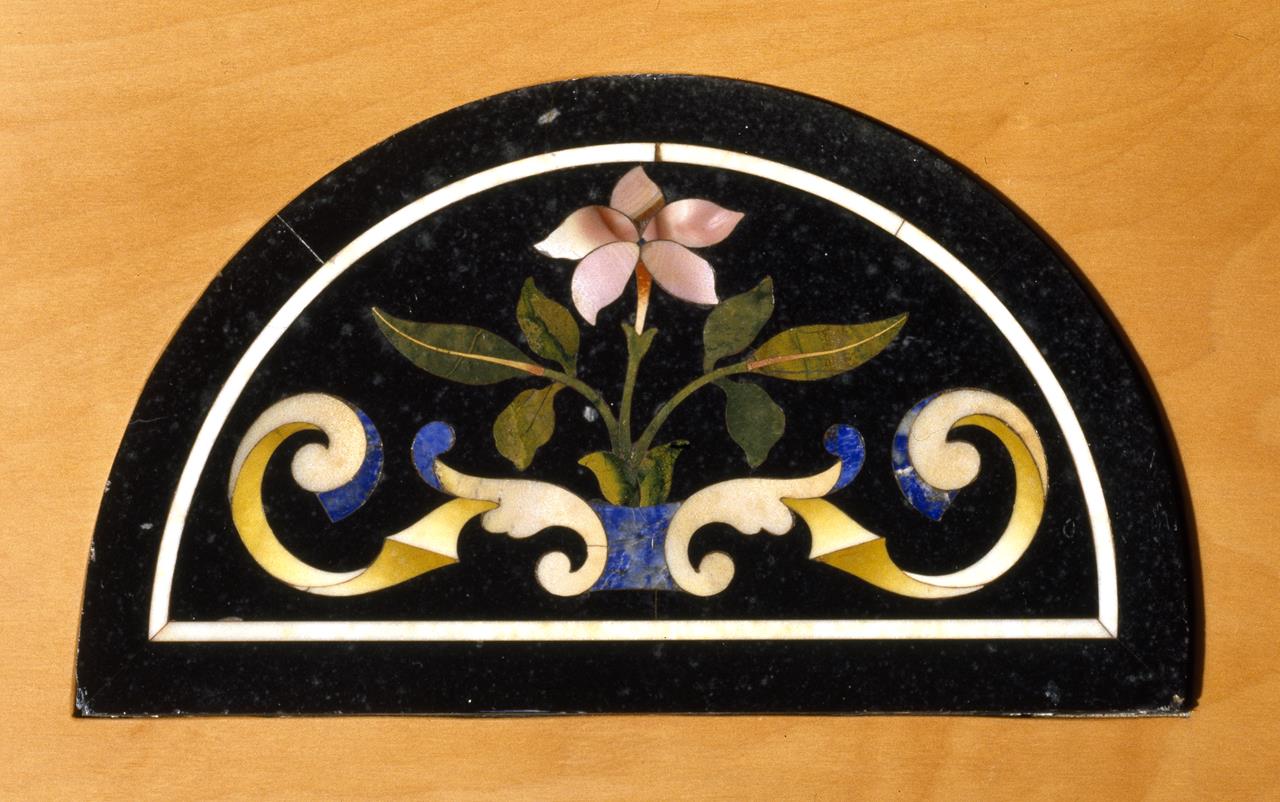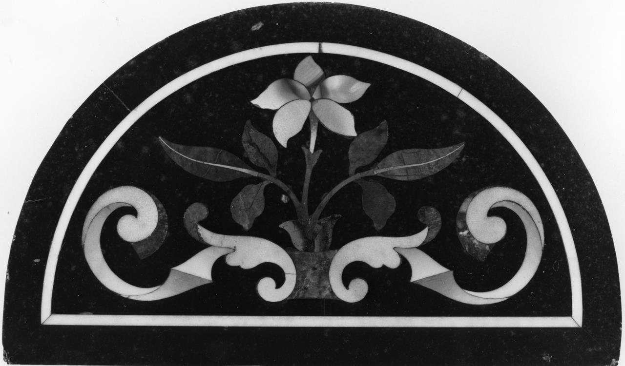 Formella semicircolare con decorazione eseguita in commesso di pietre dure, diaspro di Volterra e Sicilia su fondo di marmo nero, che mostra una decorazione di cartigli fitomorfi, perfettamente simmetrici, al cui centro, ornato da rigide foglie, appare un fiore espanso dalla ricca corolla, con grande bottone centrale